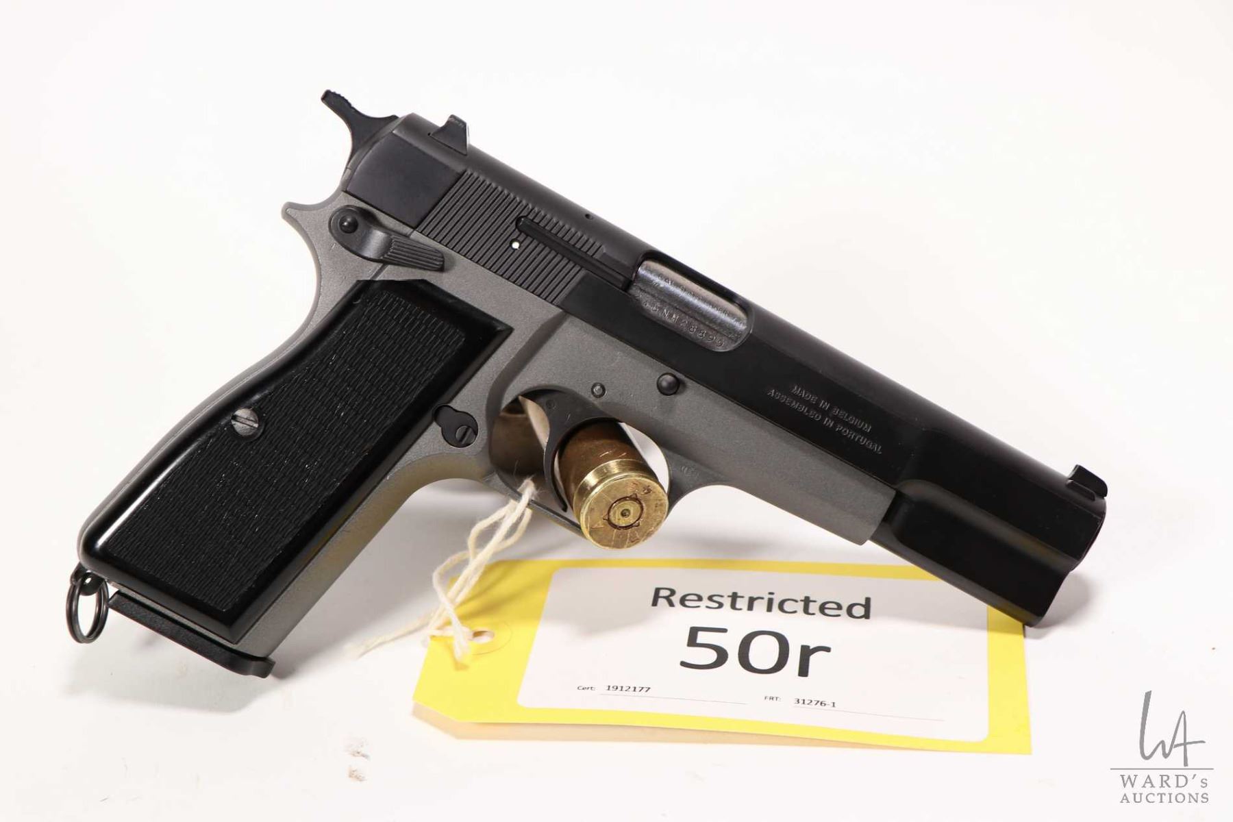 Restricted handgun Browning model Hi- Power, 9mm luger ten shot semi automatic, w/ bbl length 118mm [Blued slide on titanium finish frame. Fixed sights. Black plastic checkered grips. Includes one detachable magazine. Appears to have had very little use with only minor use, handling and storage marks.] serial # 245NM28899, PAL required