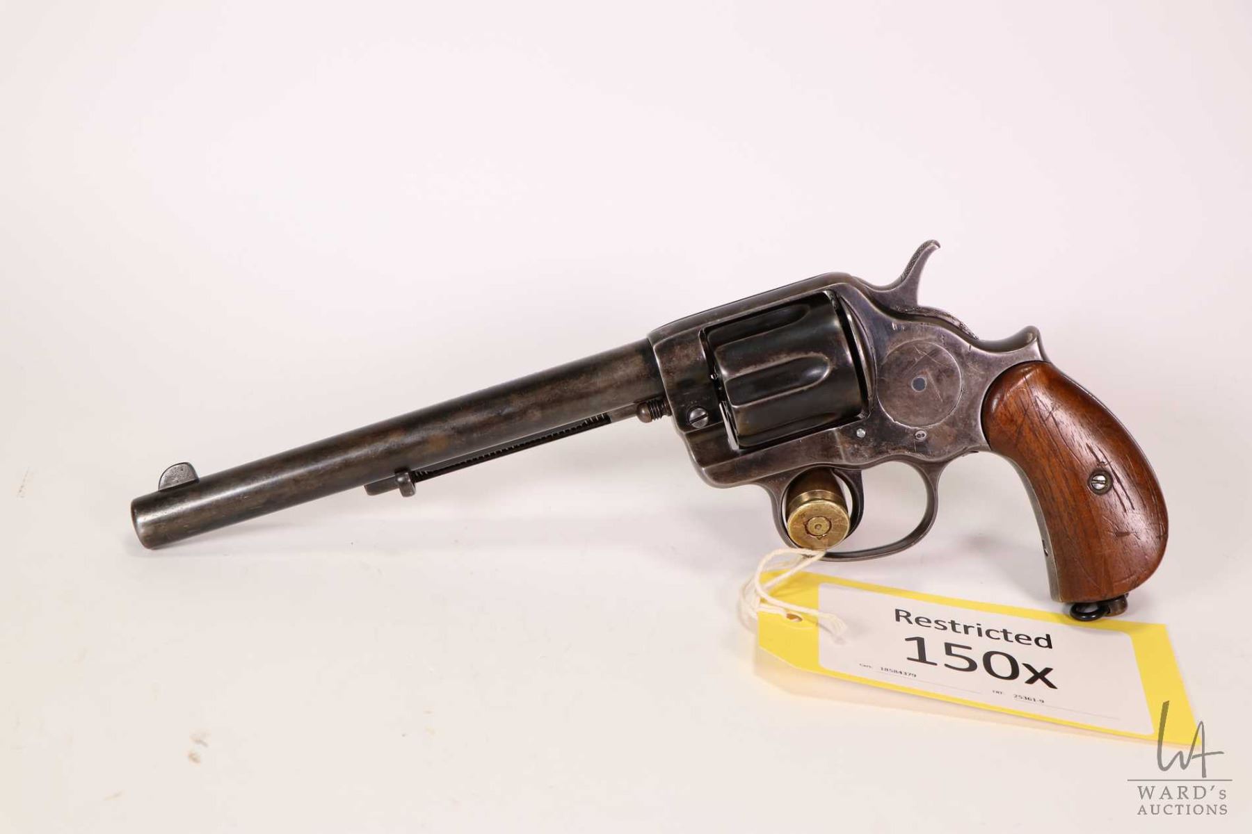 Restricted handgun Colt model 1878 DA Frontier, .45 Long Colt six shot double action revolver, w/ bbl length 190mm [Blued finish, fixed sights. Smooth wooden grips. Lanyard ring. Bluing is worn in use and handling areas and remaining finish turning brown gray. Single and double action indexing works but lock up is loose. Manufactured in 1878. Note low three digit serial no. Makes for a beautiful edition to any collection.] serial # 567, PAL required