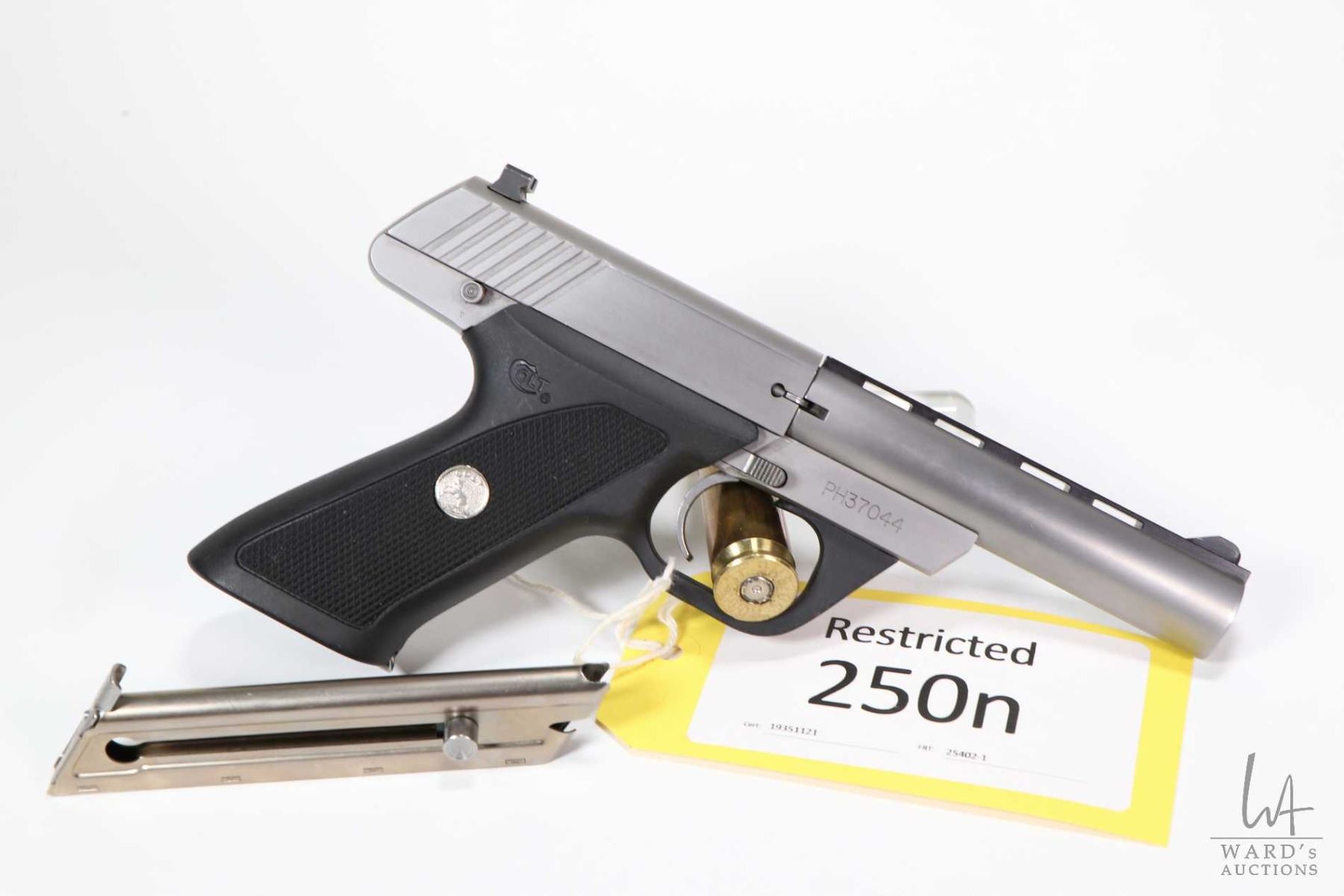Restricted handgun Colt model Colt 22 (Dated 1996), 22LR ten shot semi automatic, w/ bbl length 114mm [Satin stainless finish. Fixed front and rear sights. Polymer Colt branded checkered grips. Includes two Colt brand 10 shot magazines. Appears to have had virtually no use with only minor handling, use and storage marks.] serial # PH37044, certificate # 19351121, FRT # 25402-1 PAL required