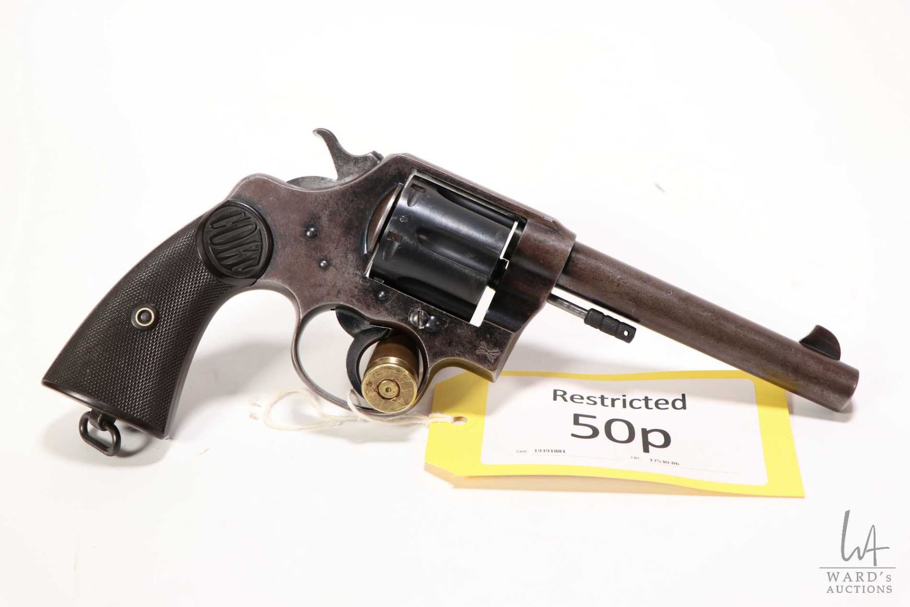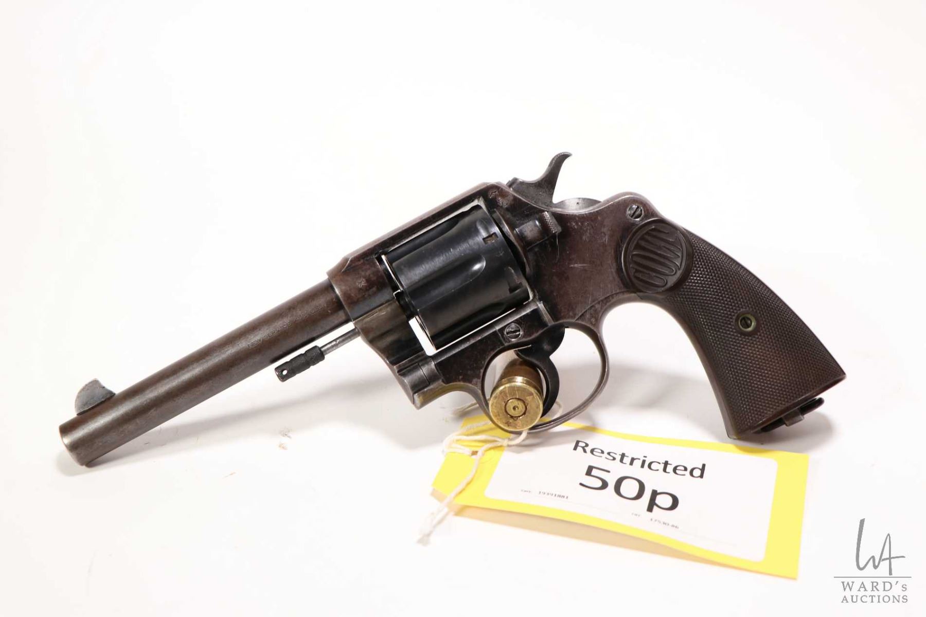 Restricted handgun Colt model New Service, .455 Rev (Eley) six double action revolver, w/ bbl length 140mm [Blued finish, turned brown gray. Fixed sights. Colt branded checkered grips. Fitted with lanyard ring. Double and single action indexing is positive although cylinder is slightly loose in each position. Bluing is worn in use and handling areas. See photos for assorted proof markings.] serial # 82547, PAL required
