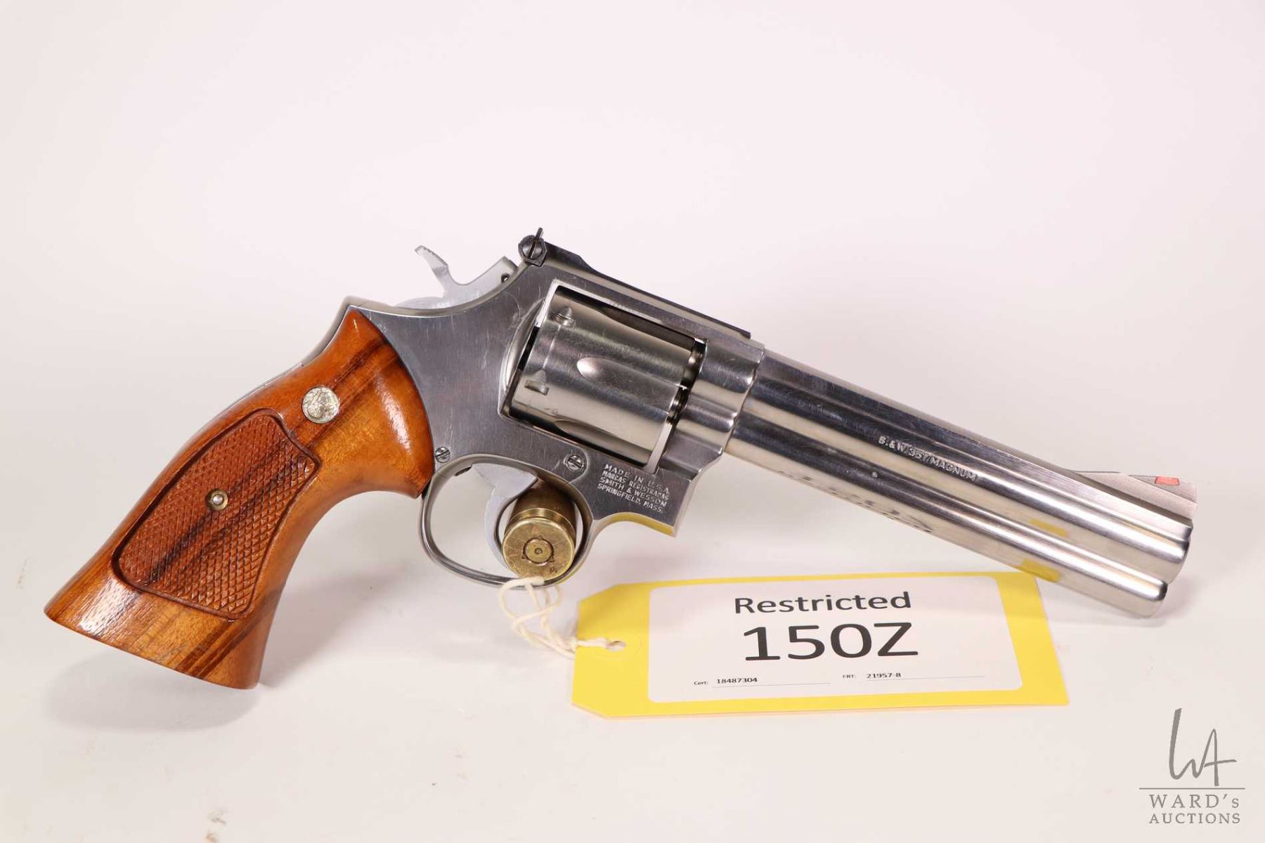 Restricted handgun Smith & Wesson model 686, .357 Mag 6 shot double action revolver, w/ bbl length 152mm [Stainless steel, fixed front and adjustable rear sights, branded checkered wooden grips, cylinder ring and other minor use and handling marks otherwise appears to have had light use] serial # AJC9220, PAL required