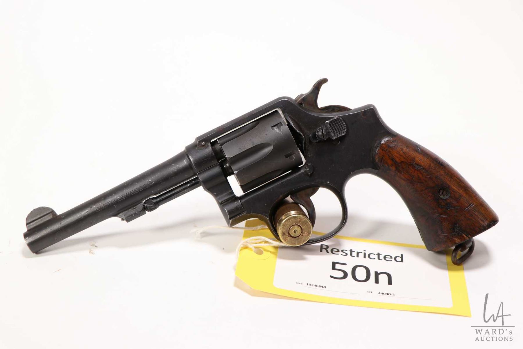 Restricted handgun Smith & Wesson model Victory, .38 S&W six shot double action revolver, w/ bbl length 127mm [Battle finish, fixed sights and smooth wooden grips. Fitted with lanyard ring. Single and double action indexing is reasonably good, as is trigger operation. Used condition with use, handling and storage marks on wood and metal.] serial # V580014, PAL required
