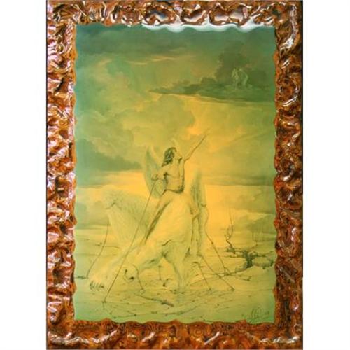 This is a fantastic piece, titled ?Restrictions?. Pitre?s most famed work, this piece is a statement on the restrictions that the world places on man versus the freedom one finds when they look to the heavens. The colors in this print are as powerful as the message it sends, and the bright blues and greens render a fantastic depiction of skies and clouds. The original frame offers an organic dimension to this piece, by using a textured piece of wood that is as beautiful as it is unique. This is a very strong piece that speaks volumes and is an amazing and original buy.