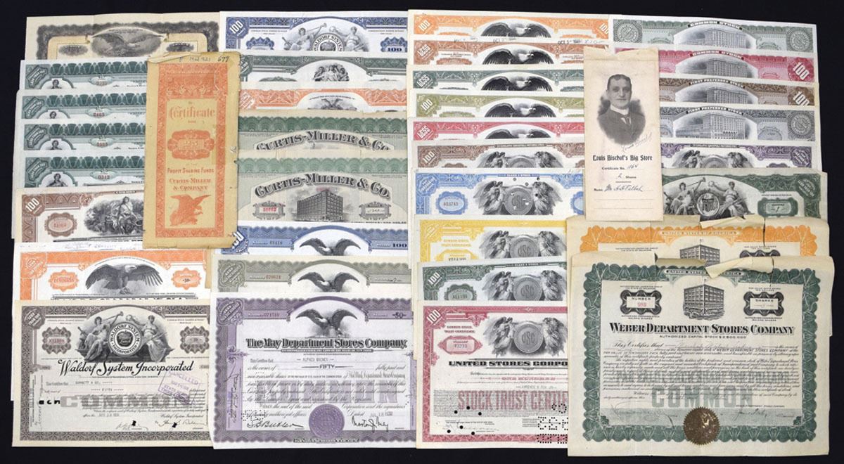 Various States, 1900-60s. Lot of 30+ stock and bond certificates from retail and department store companies. Highlights include: United Stores Corporation; The May Department Stores Company; Weber Department Stores Company; United Retail Stores Corporation; Curtis-Miller & Co.; and Siegel Stores Corporation. Also features examples from Reading Company, Mangel Stores Corporation, and others. Certificates display a wide range of border colors including red, green, orange, blue, and brown, many with allegorical vignettes, store building imagery, and eagle motifs. Condition generally VF to XF, with scattered cancellations, folds, and edge wear. (30+). Sold "AS IS," no returns accepted.