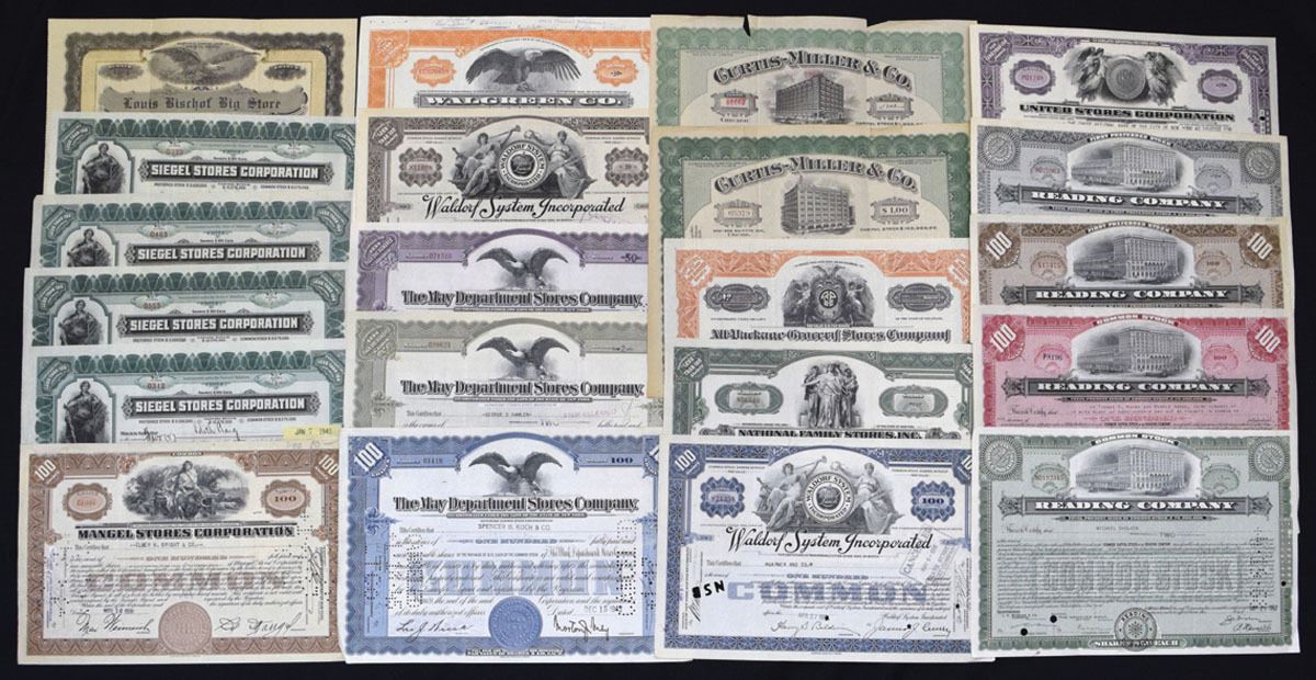Various States, 1900-60s. Lot of 30+ stock and bond certificates from retail and department store companies. Highlights include: United Stores Corporation; The May Department Stores Company; Weber Department Stores Company; United Retail Stores Corporation; Curtis-Miller & Co.; and Siegel Stores Corporation. Also features examples from Reading Company, Mangel Stores Corporation, and others. Certificates display a wide range of border colors including red, green, orange, blue, and brown, many with allegorical vignettes, store building imagery, and eagle motifs. Condition generally VF to XF, with scattered cancellations, folds, and edge wear. (30+). Sold "AS IS," no returns accepted.