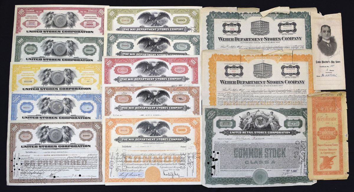 Various States, 1900-60s. Lot of 30+ stock and bond certificates from retail and department store companies. Highlights include: United Stores Corporation; The May Department Stores Company; Weber Department Stores Company; United Retail Stores Corporation; Curtis-Miller & Co.; and Siegel Stores Corporation. Also features examples from Reading Company, Mangel Stores Corporation, and others. Certificates display a wide range of border colors including red, green, orange, blue, and brown, many with allegorical vignettes, store building imagery, and eagle motifs. Condition generally VF to XF, with scattered cancellations, folds, and edge wear. (30+). Sold "AS IS," no returns accepted.