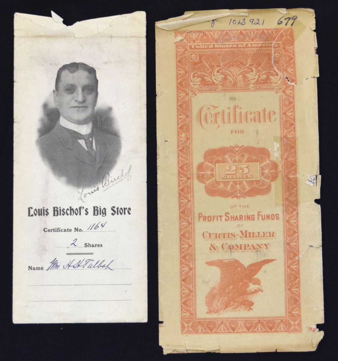 Various States, 1900-60s. Lot of 30+ stock and bond certificates from retail and department store companies. Highlights include: United Stores Corporation; The May Department Stores Company; Weber Department Stores Company; United Retail Stores Corporation; Curtis-Miller & Co.; and Siegel Stores Corporation. Also features examples from Reading Company, Mangel Stores Corporation, and others. Certificates display a wide range of border colors including red, green, orange, blue, and brown, many with allegorical vignettes, store building imagery, and eagle motifs. Condition generally VF to XF, with scattered cancellations, folds, and edge wear. (30+). Sold "AS IS," no returns accepted.