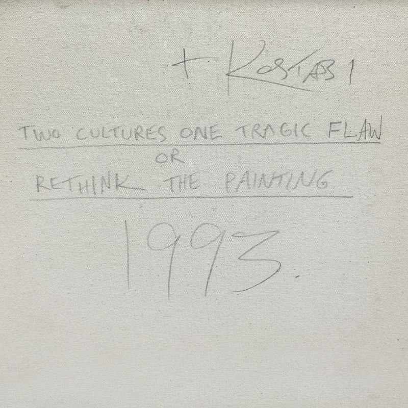 "Rethink the Painting" is an original painting on canvas by Mark Kostabi & Tadanori Yokoo. This piece is part of a series of paintings created jointly by Kostabi and Yokoo. This collaboration received extensive media coverage, notably for the resulting legal dispute between the two artists; this piece was acquired from the attorney mediating the dispute. This piece is hand signed by both artists and comes custom framed. Includes Letter of Authenticity. Measures approximately 60.5" x 49" (frame), 58.5" x 46.5" (image).