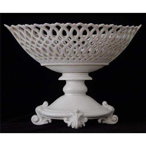 Antique reticulated white porcelain centerpiece / compote with decorative foot made out of two porcelain parts joined by metal screw. Please ask questions, request additional photos and shipping costs prior to bidding.