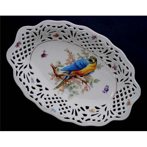 Reticulated oval bowl decorated with a blue and yellow parrot. It is marked on the underside with the Schumann Germany mark used around 1945. In very good used condition as shown. Please ask questions, request additional photos and shipping costs before buying.
