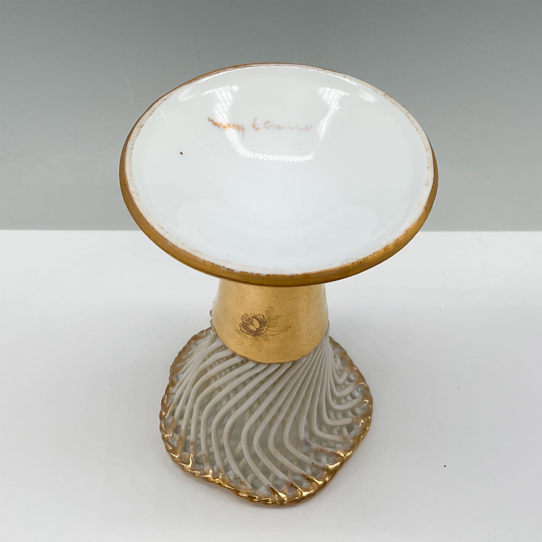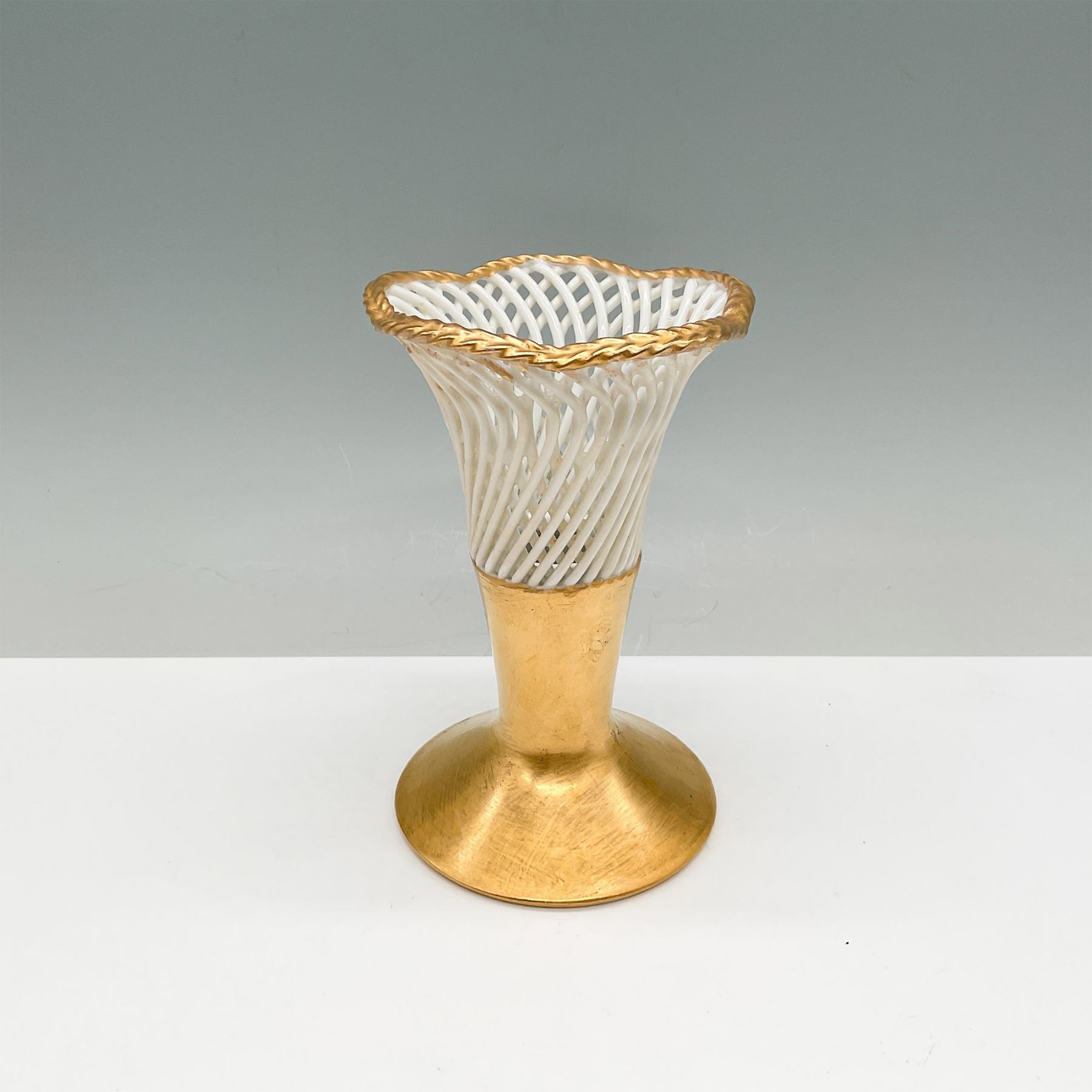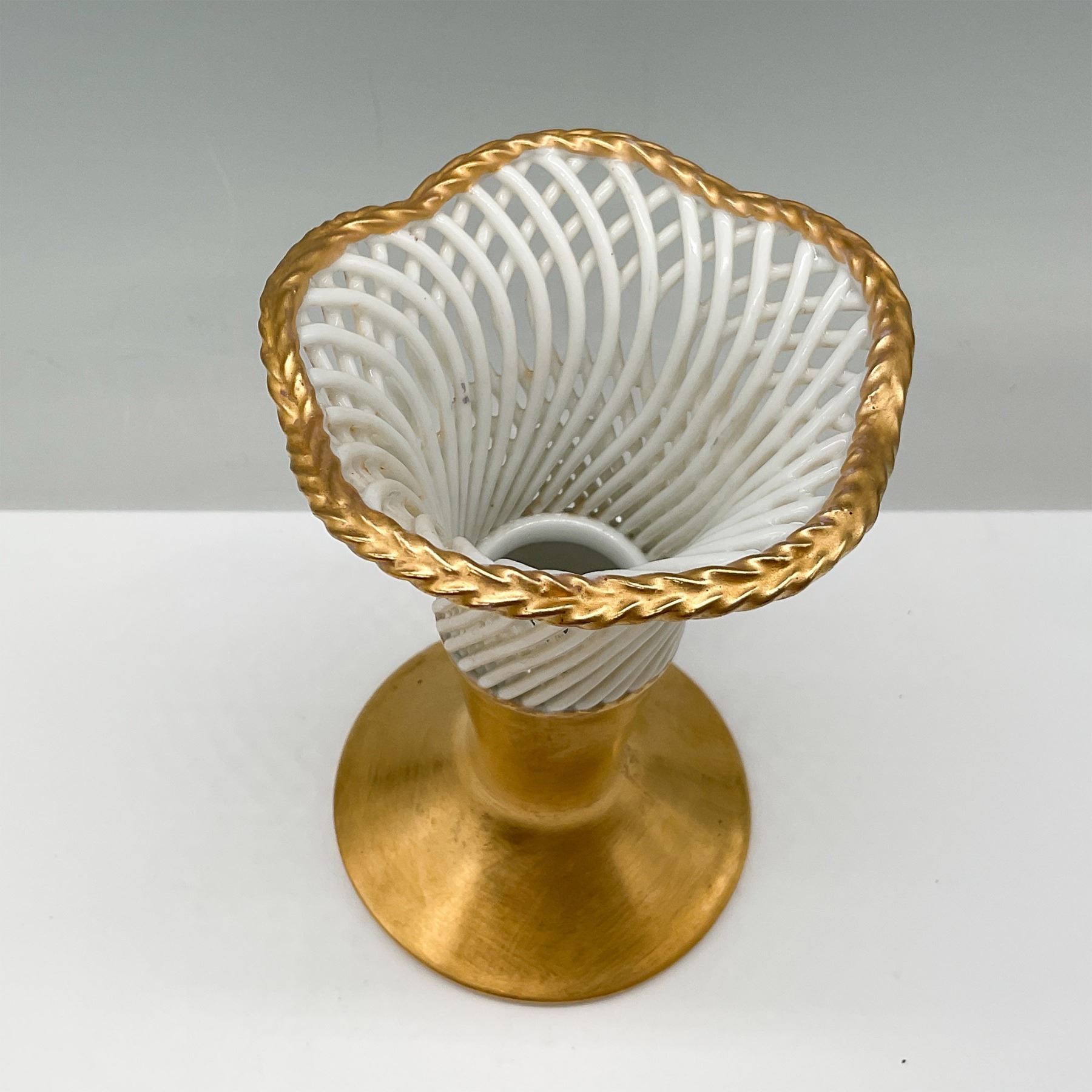 Exquisite porcelain trumpet vase featuring a finely reticulated upper section with an intricate lattice design. The rim is adorned with a delicately braided gilt edge, while the lower portion and flared base are lavishly decorated in gold. The piece bears a hand-painted inscription. This vase embodies elegance and refinement, making it a distinguished addition to any collection.