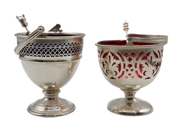 Pair of reticulated Sterling baskets with glass inserts. Also come with sterling spoons. One basket is also marked Gorham.