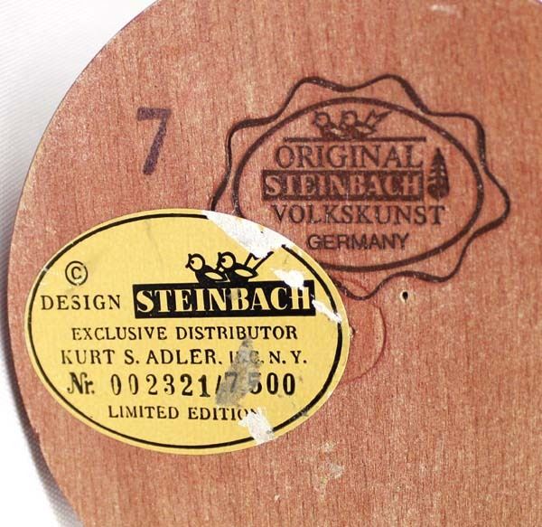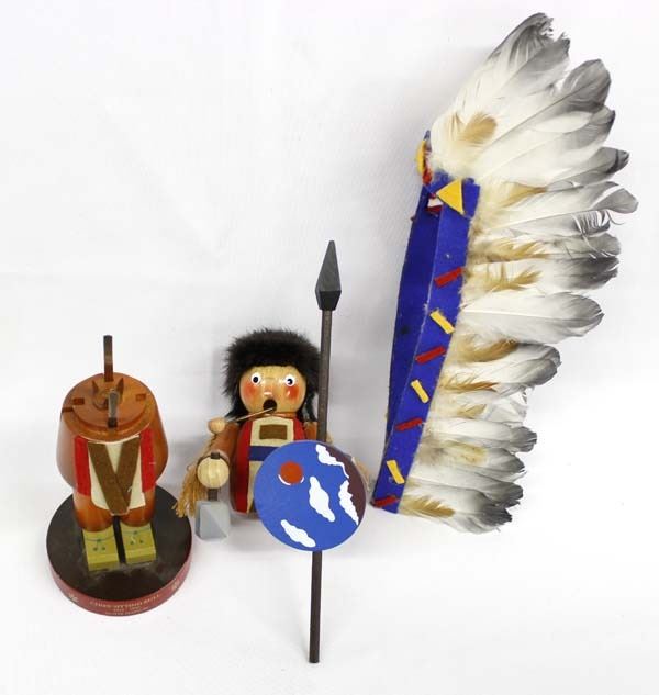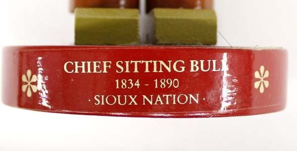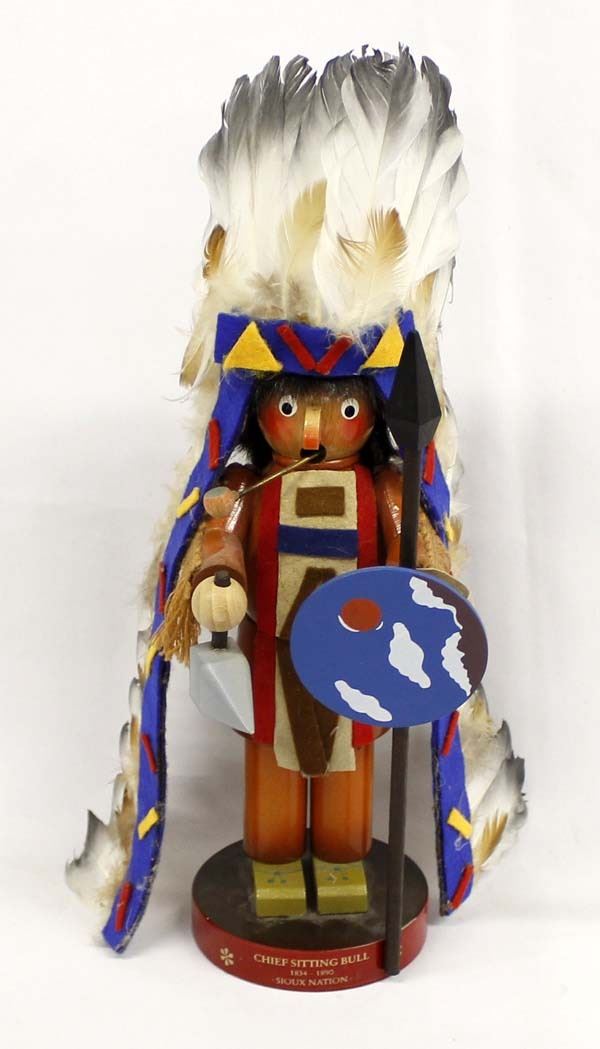 Retired German Steinbach Chief Sitting Bull Nutcracker, 1834-1890, Sioux Nation measures 4'' x 23'', embellished with feathers and faux fur, comes with original tag, 1st Nutcracker Design in the Famous Chieftains Series a Limited Edition of 7,500 Pieces, No. 002321/7500, ''Steinbach produced the Famous Chieftain limited edition series in the 1990s''