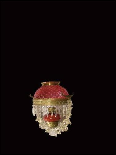 Retractable hanging oil lamp fixture with cranberry hobnail shade, very good condition.