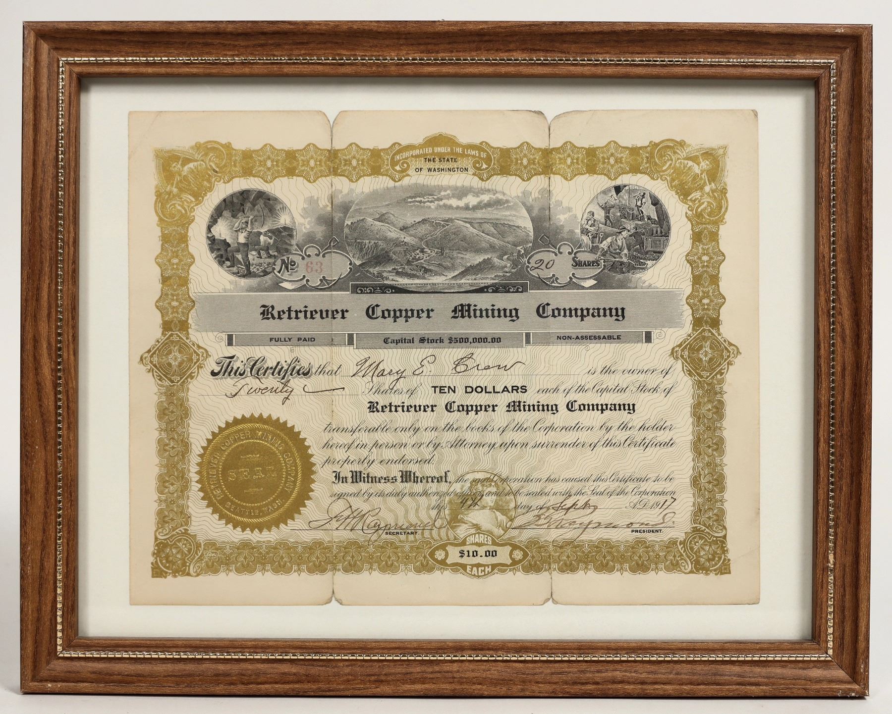 The Retriever Copper Mining Company was incorporated in Washington State. Property was on Texada Island, British Columbia. This stock certificate was issued to Mary E. Crew in 1917. Copper was a significant ore in preparation for WW1. This certificate has a beautiful vignette of a mountain range flanked by working miners on either side. The seal bears Seattle, Washington. Two folds with foxed edges, a gold border, foxed corners very readable. Framed at 11.5 in. X 14 in. Please see photo for details.