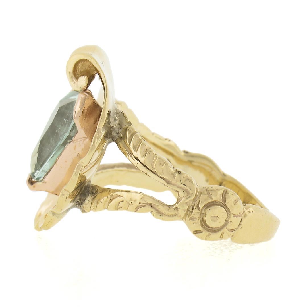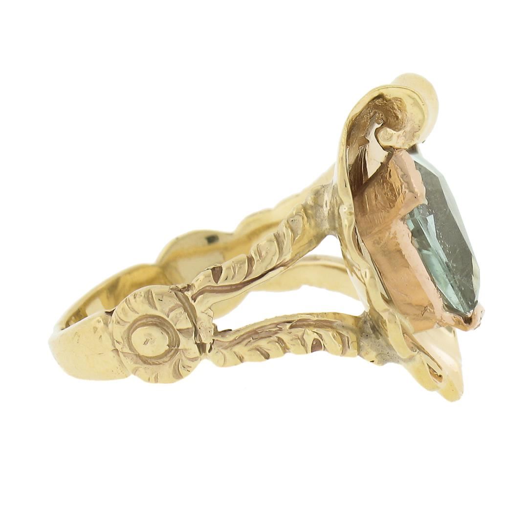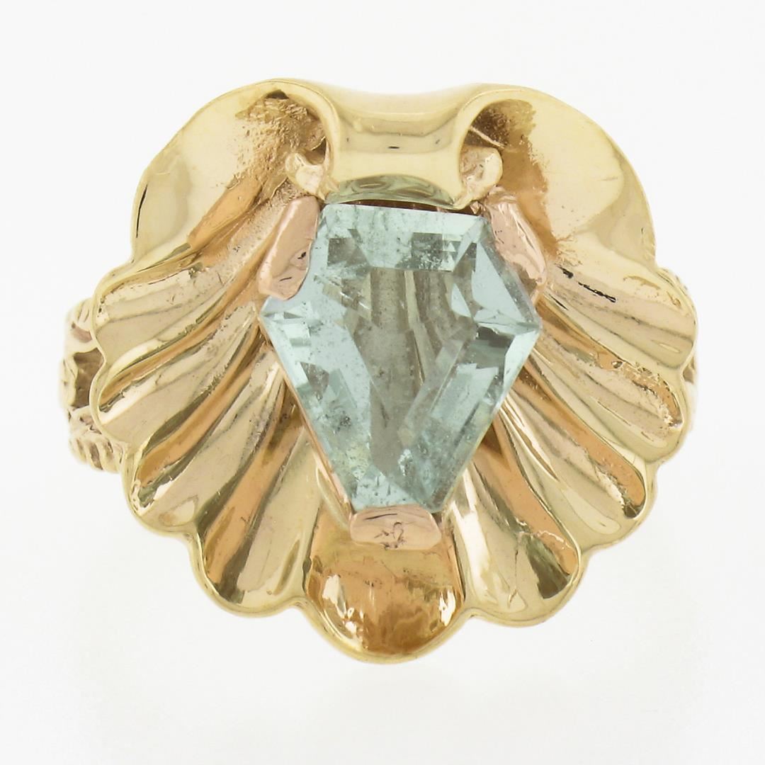 A vintage retro 14k rosy yellow gold ring, with 1 natural aquamrine ( 9.4x8.3mm). The ring is size 5.5, weighs a total of 5.35 grams, and measures 16.9mm wide.