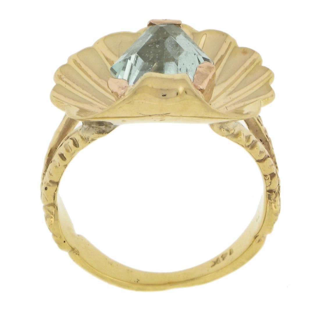 Retro 14k Rosy Yellow Gold Unique Shape Aquamarine in Scalloped Shell Split Ring