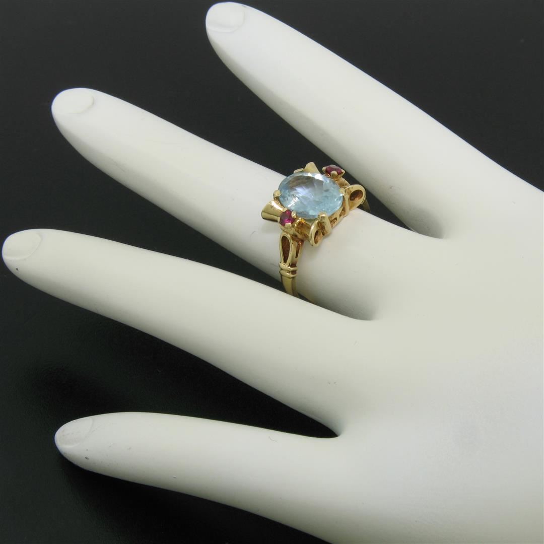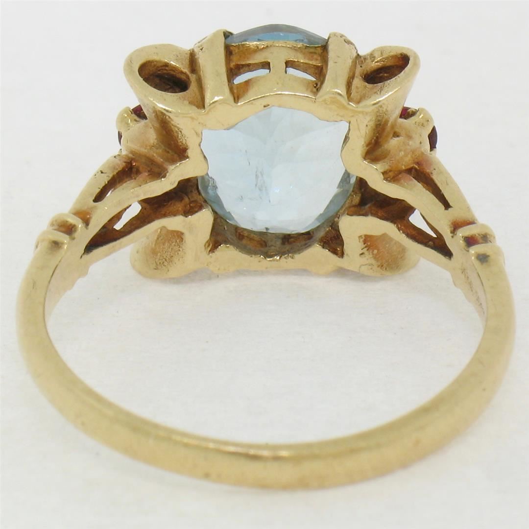 A vintage 14k yellow gold 2.18ct oval aquamarine and simulated ruby ring. The ring is size 6.0, weighs a total of 3.23 grams, and measures 10.10mm wide.