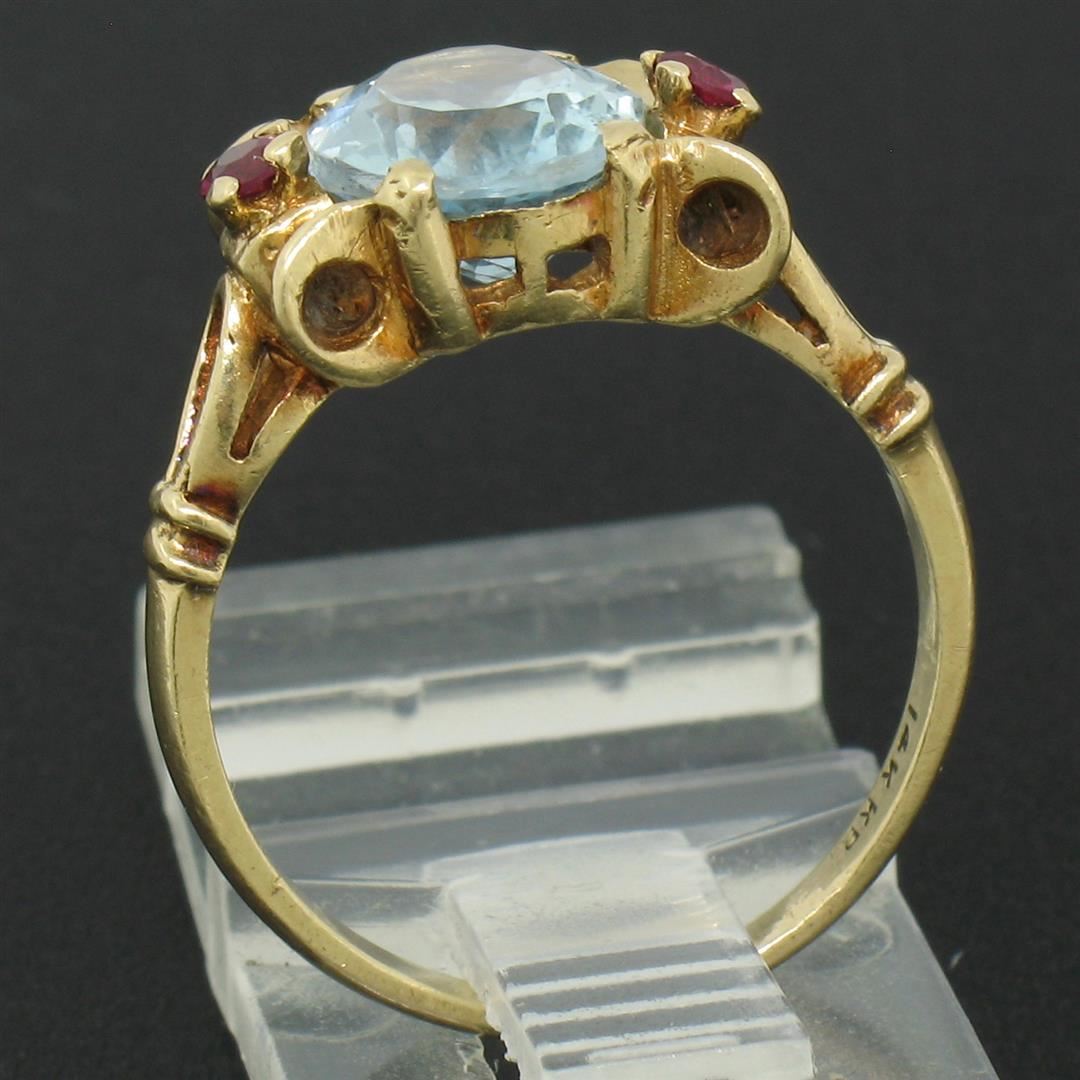 A vintage 14k yellow gold 2.18ct oval aquamarine and simulated ruby ring. The ring is size 6.0, weighs a total of 3.23 grams, and measures 10.10mm wide.