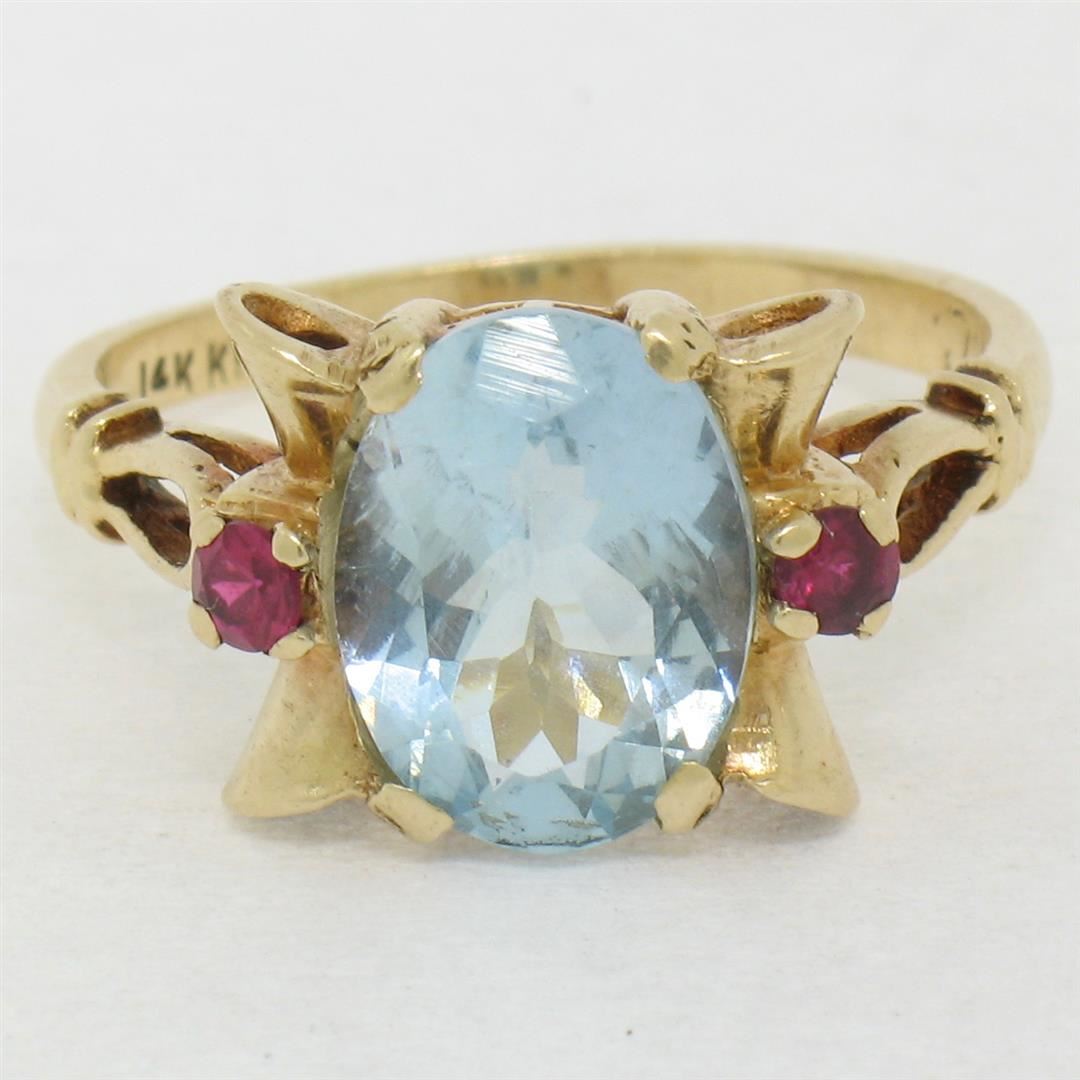 A vintage 14k yellow gold 2.18ct oval aquamarine and simulated ruby ring. The ring is size 6.0, weighs a total of 3.23 grams, and measures 10.10mm wide.