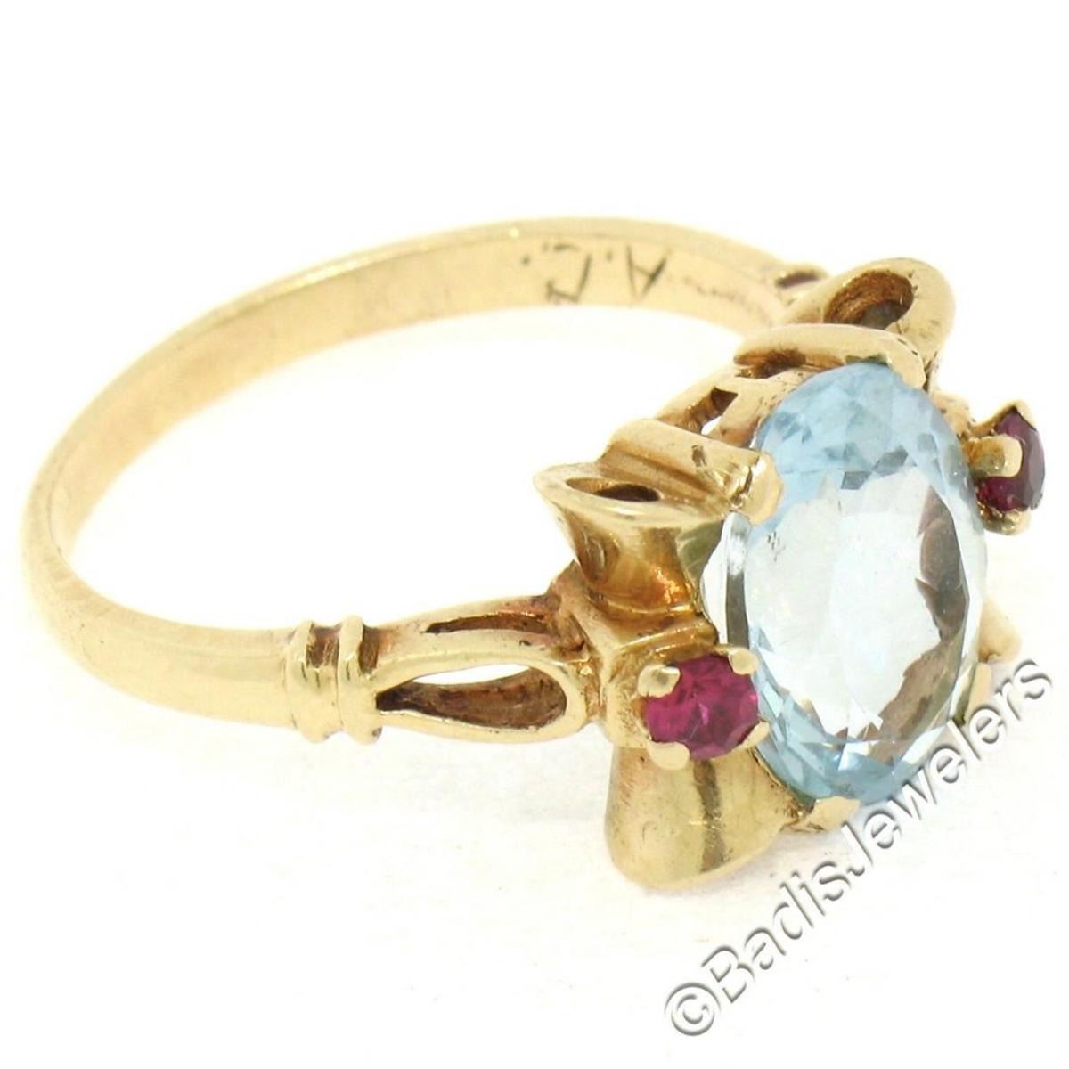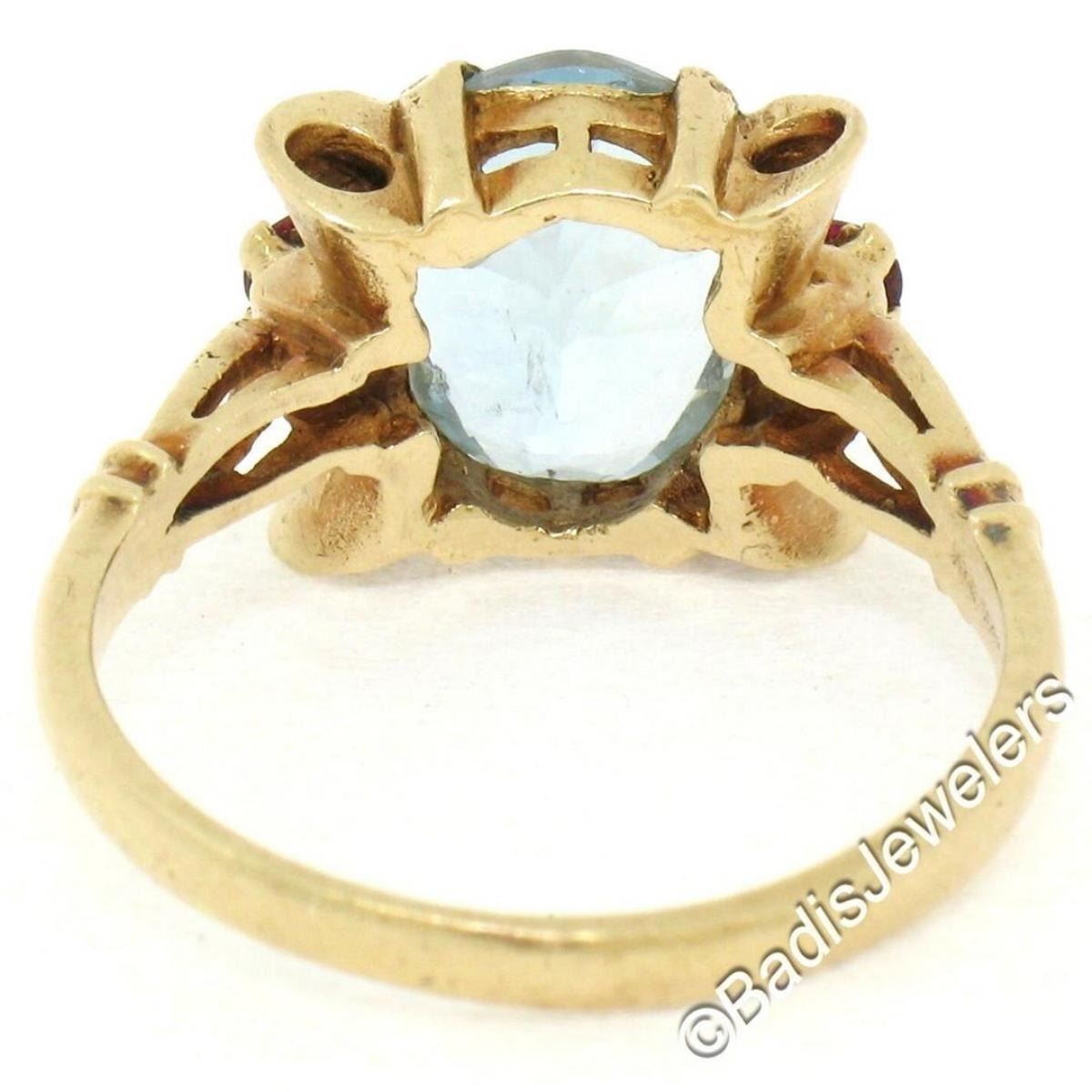 A vintage 14kt yellow gold 2.18ct oval aquamarine and simulated ruby ring. The ring is size 6.0, weighs a total of 3.23 grams, and measures 10.10mm wide.