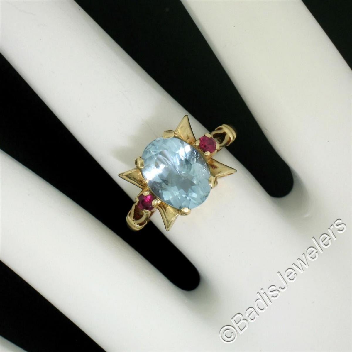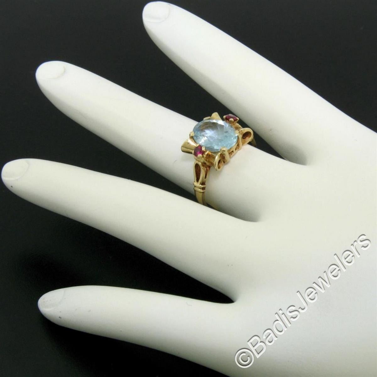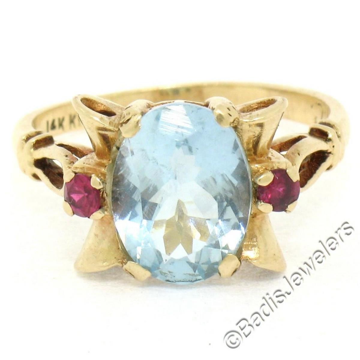 A vintage 14kt yellow gold 2.18ct oval aquamarine and simulated ruby ring. The ring is size 6.0, weighs a total of 3.23 grams, and measures 10.10mm wide.