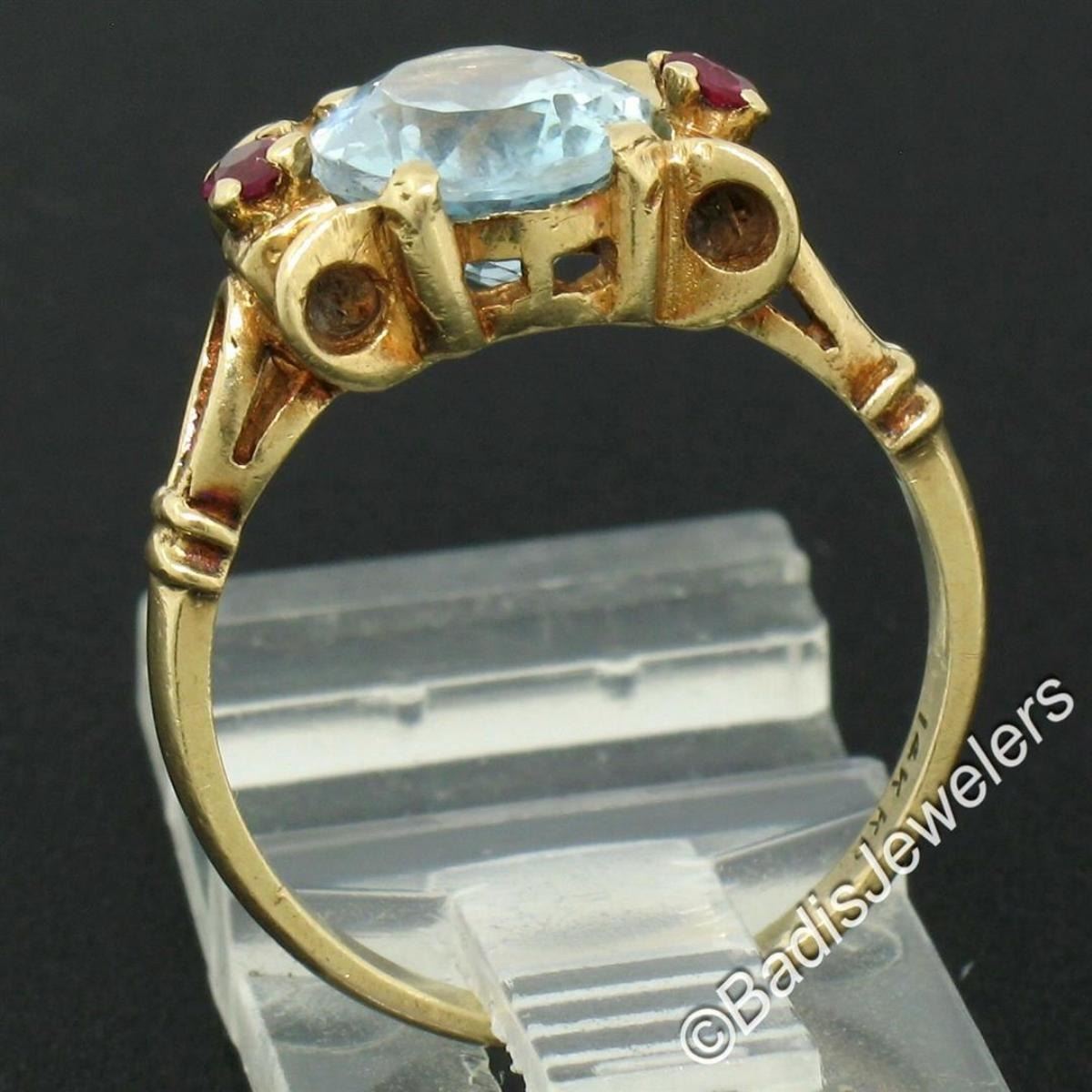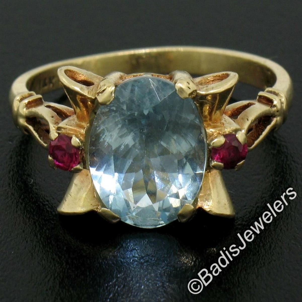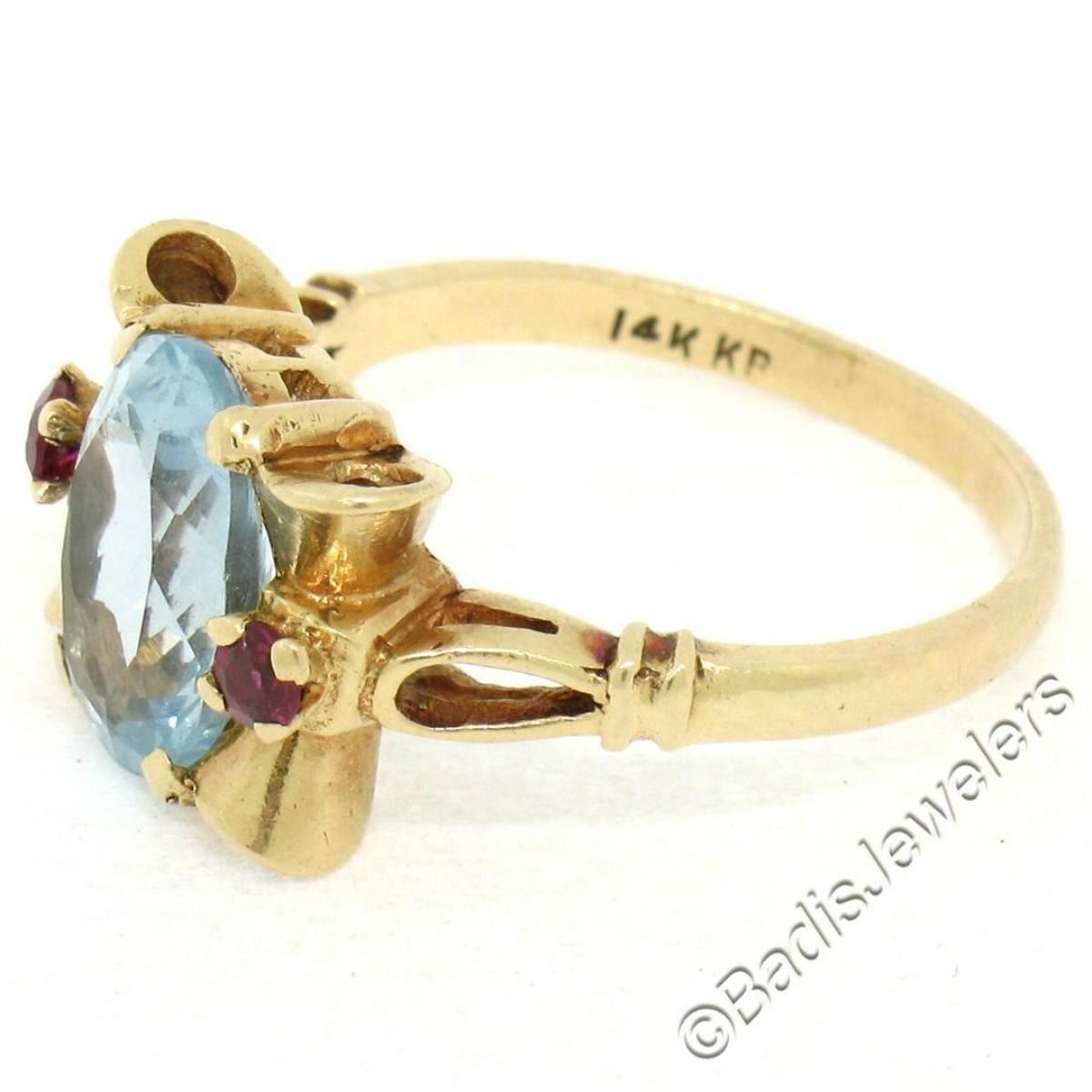 A vintage 14kt yellow gold 2.18ct oval aquamarine and simulated ruby ring. The ring is size 6.0, weighs a total of 3.23 grams, and measures 10.10mm wide.