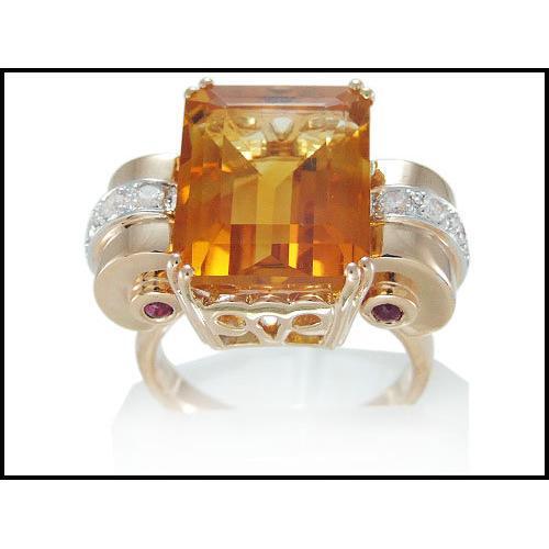 Gorgeous retro ring with 1 center citrine that weighs approximately 10.20 carats, 4 side rubies that weigh approximately 0.20 carats and 10 side diamonds that weigh approximately 0.30 carats set in 18K pink gold. The size 6-1/2 ring measures 16 millimeters (5/8 inches) long x 24 millimeters (15/16 inches) wide x 29 millimeters (1-1/8 inches) high and weighs 10.50 grams total weight.