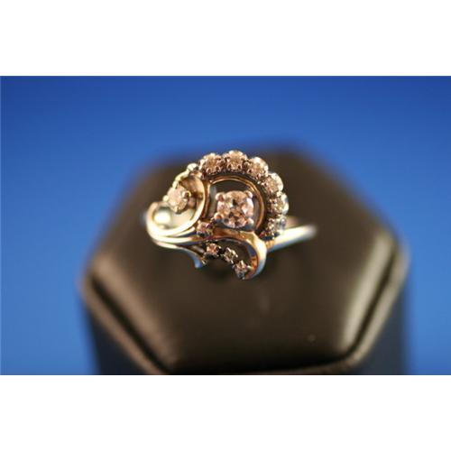 A fantastic and fun right hand diamond ring from the 1940's. The focal diamond is .33 cts, the total carat weight is estimated to benearly one carat. All the diamonds are bright and clear. This ring weighs 4.2 grams and is a size 8(sizable by me or by your jeweler).