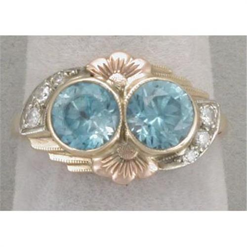 Retro rose gold ((16K, unmarked but tested) ring set with two 6MM genuine blue zircons (estimated to weigh 1.2 carat each, or 2.4 carat total), accented with six .03 - .05 carat single-cut diamonds. It is a size 7 1/2 and weighs 2.9 grams.