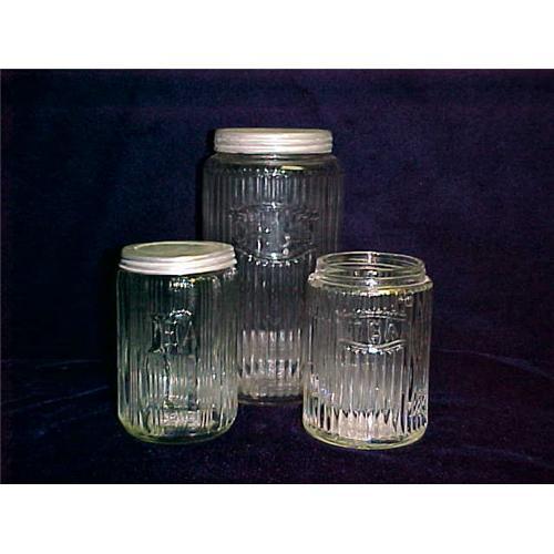 Retro Canister Set for Coffee and Tea. Coffee canister with lid is approx. 8" tall and 2 tea canisters, one with lid and the other without, measure approx. 5" tall. Great set. Probably for Hoosier Cabinet.