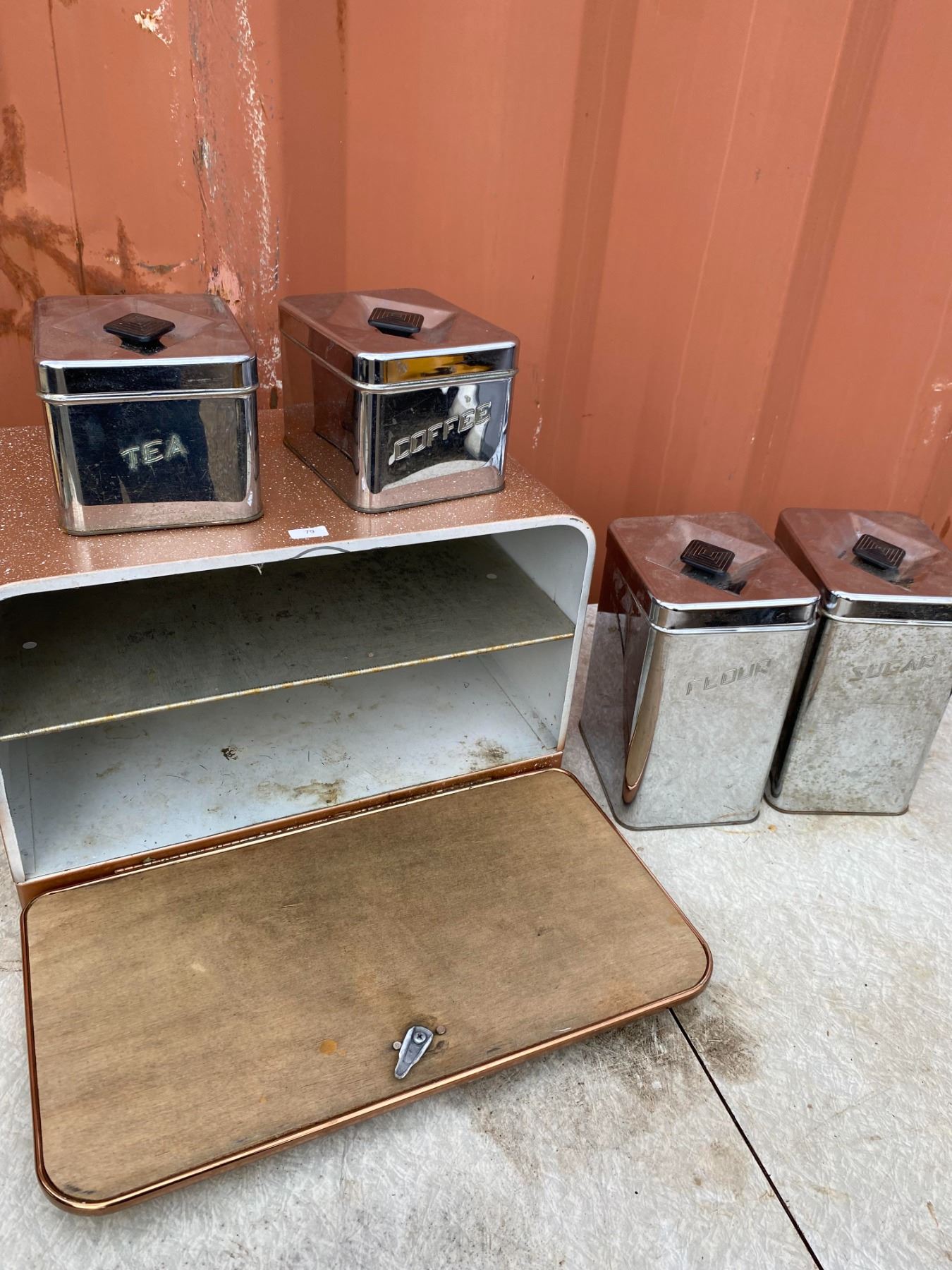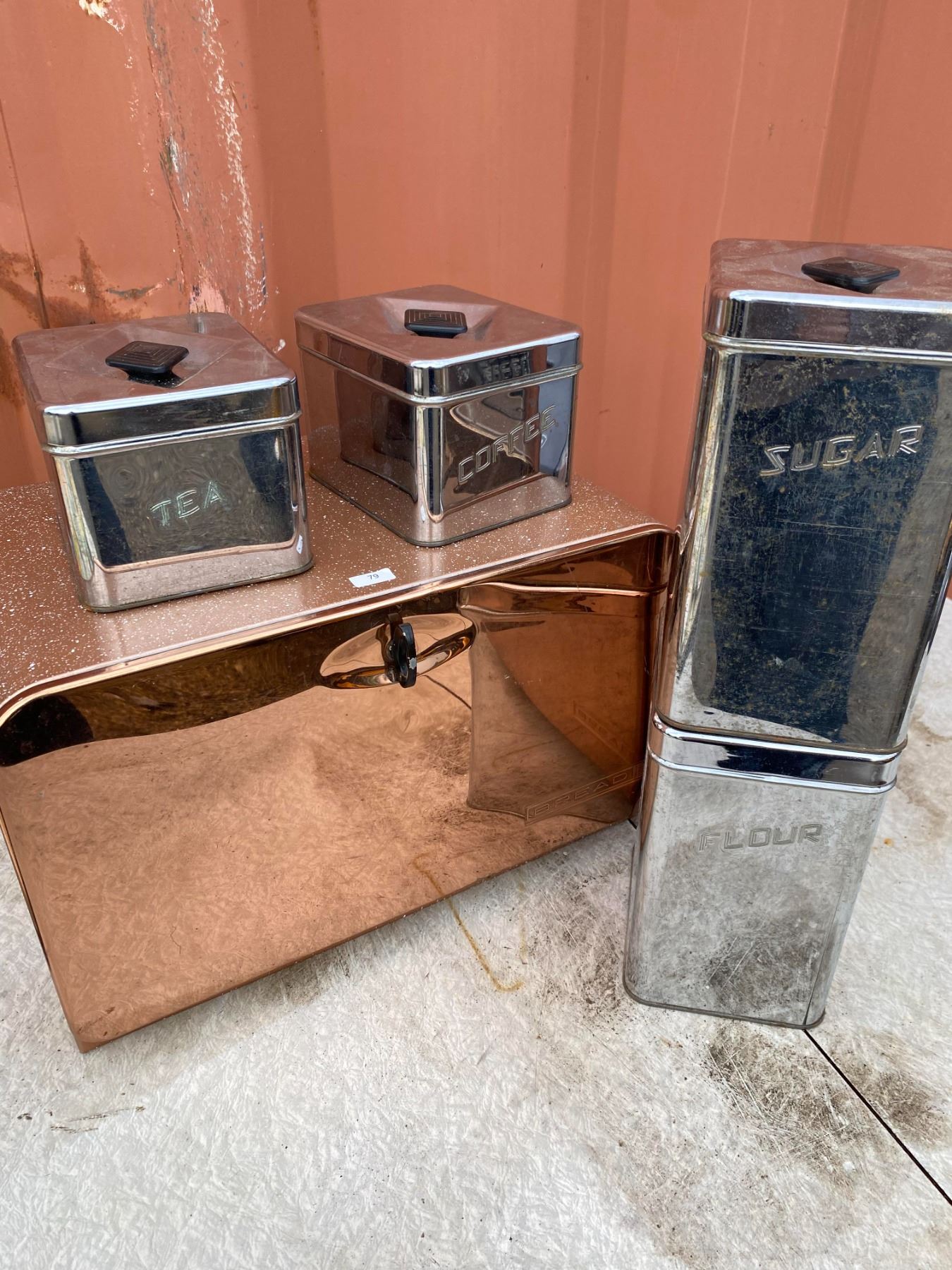 Vintage kitchen canister grouping including chrome sugar, coffee, tea containers plus a copper-toned breadbox; shows typical age wear and patina.