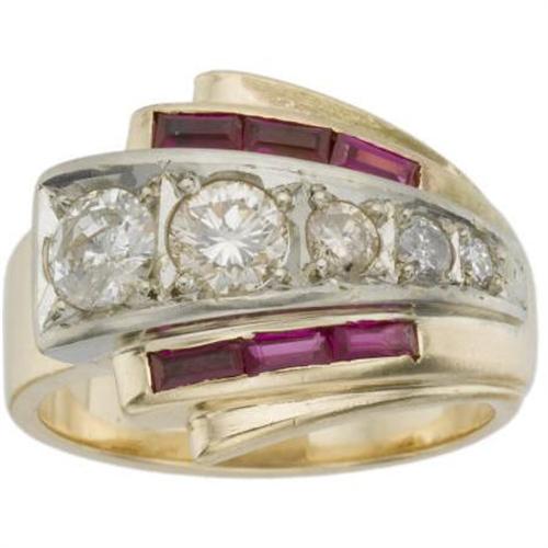 <B>Retro Diamond, Synthetic Ruby, Gold Ring</B></I> The ring features a line of round brilliant-cut diamonds, graduated in size, weighing a total of approximately 1.00 carat, enhanced by baguette-cut synthetic rubies, set in 14k yellow gold with rhodium finished accents. Gross weight 11.50 grams. <BR><I>*Note: Size 8 (sizeable)</B></I><BR><BR><b>Shipping:</b> Miscellaneous Collectibles, Smal (<a target="_blank" href="http://www.heritageauctions.com/common/shipping.php">view shipping information</a>)