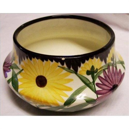 Geometric shape, hand painted high glaze earthenware Cache Pot marked Germany in wonderful condition. Garland of smaller yellow daisy heads with solid black bordered rim. Random yellow and magenta large flower heads with broad stroke greenery and buds cover the entire outside. High sheen glazing.<p>Pot measures 6.5 inches in diameter by