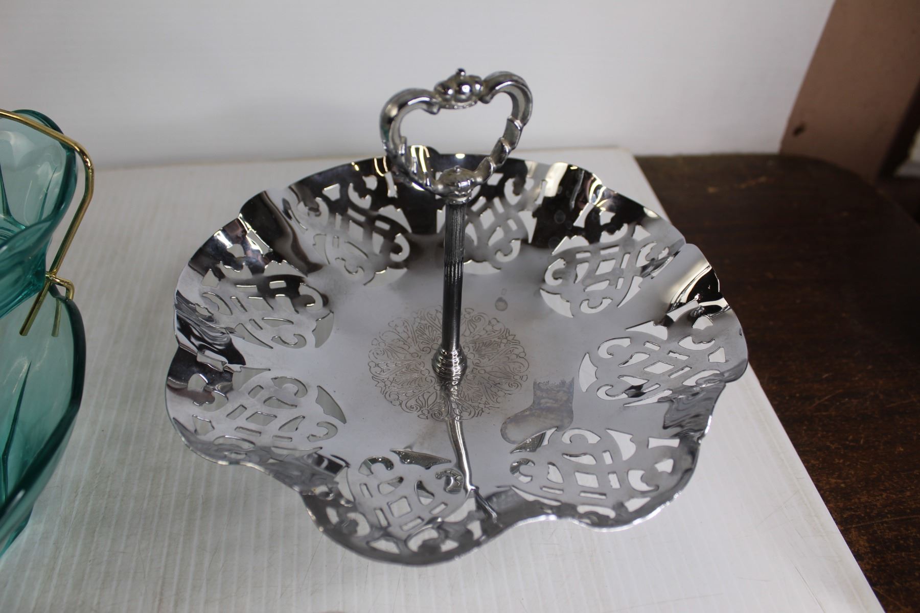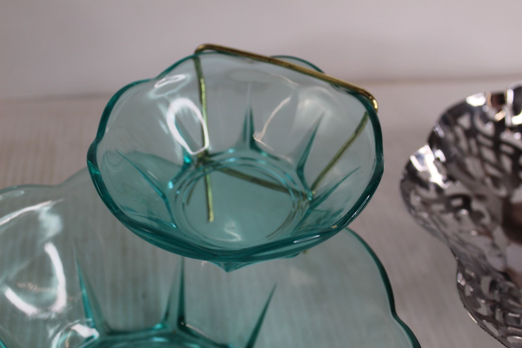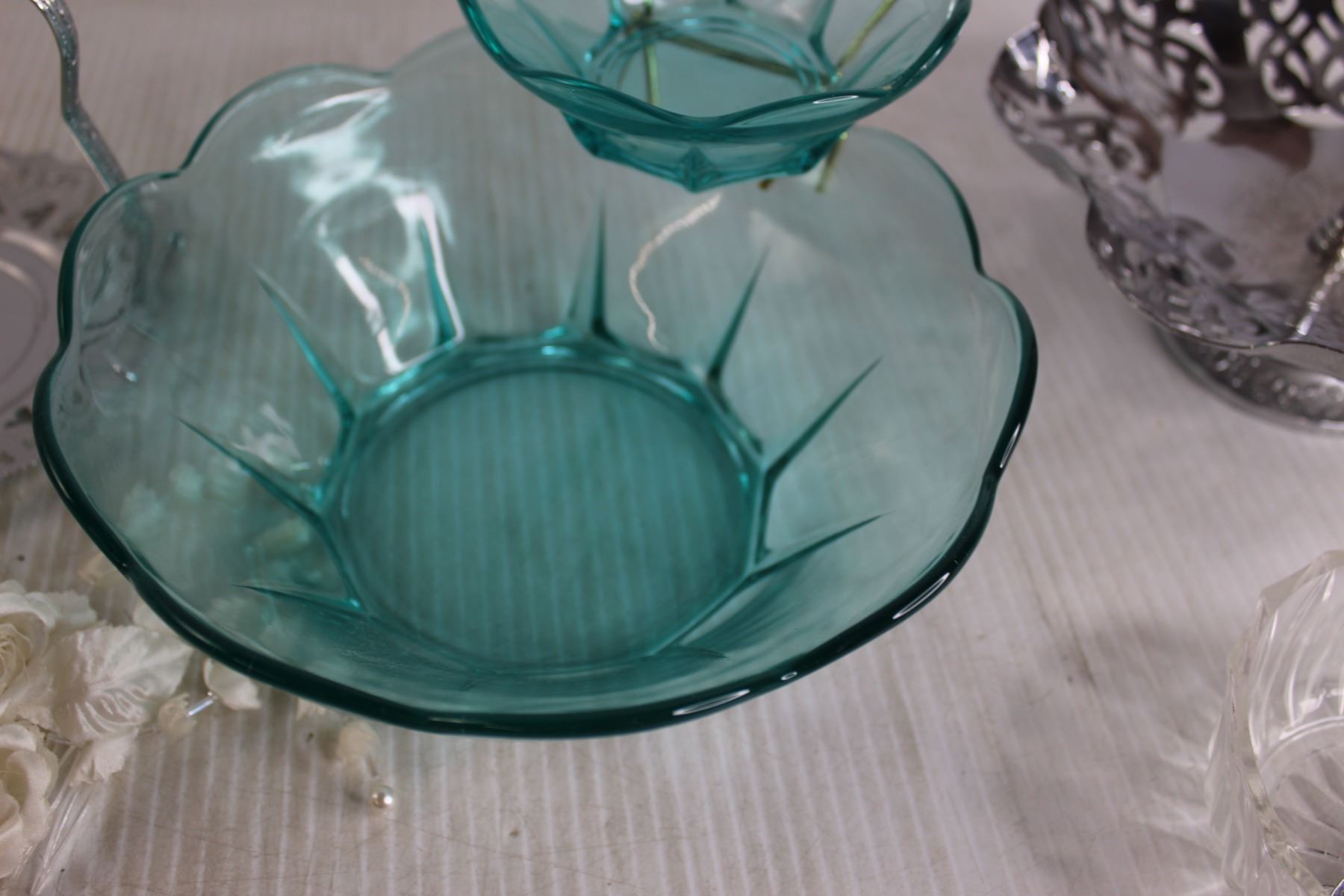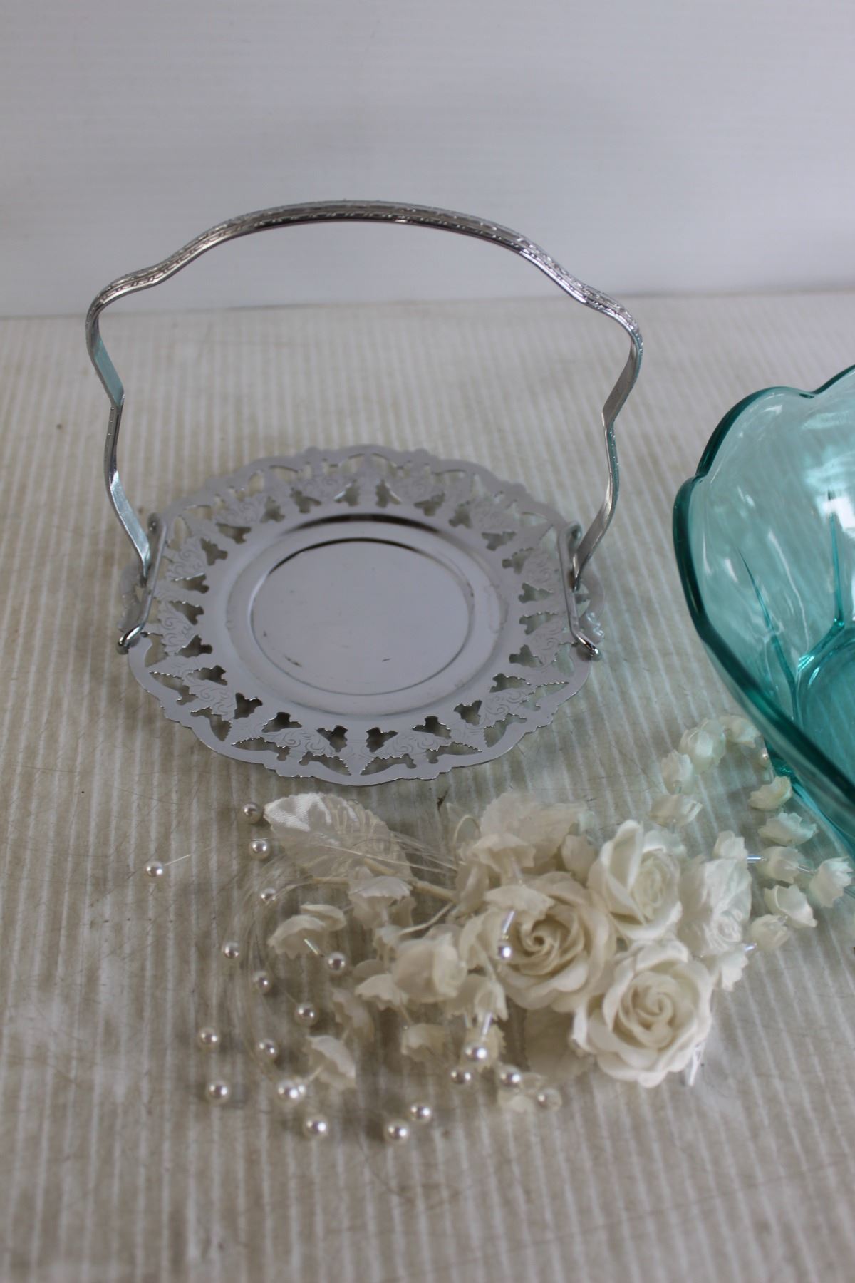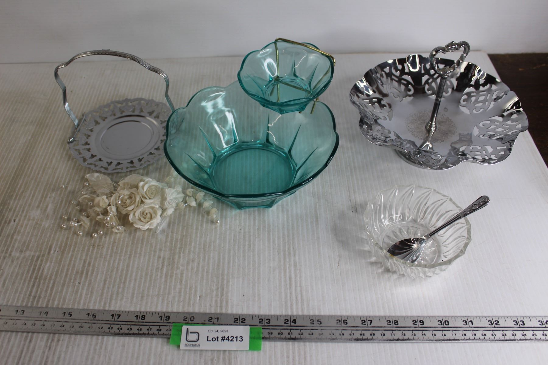 Retro Flower and Pearl Hair Comb, Turquoise Blue Chip and Dip Bowls, Chrome Plated Serving Dishes