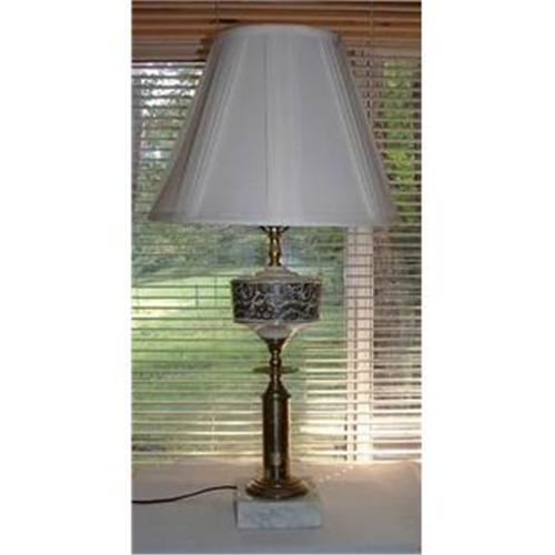 Retro 70's Lamp with shade, 28 inches, polished brass and porcelain. Excellent condition. Brown paisley design.