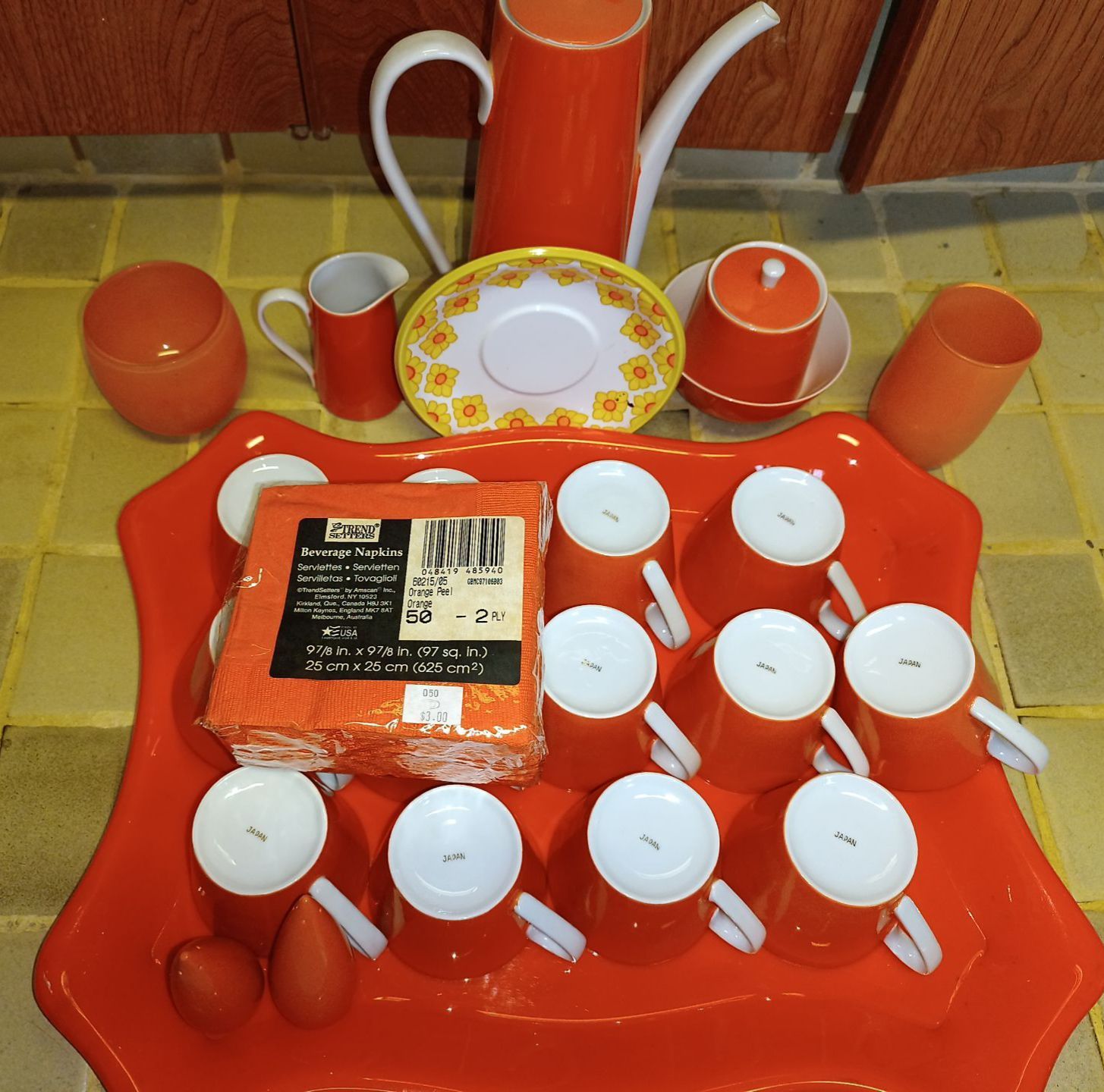 Retro MCM Orange Cup & Jug Set- Made in Japan w/ Napkins + Matching Tray