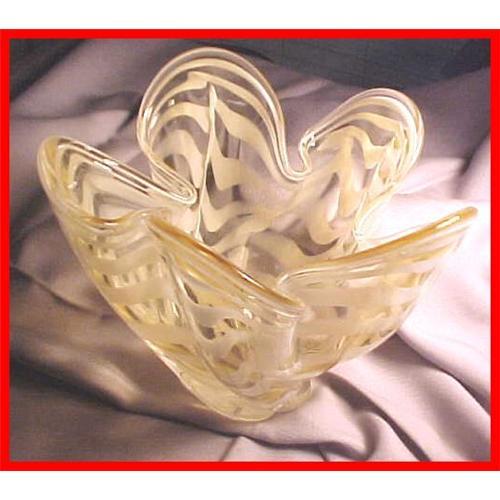 This 7" tall Murano Italy heavy studio art glass is shaped-like a freeform handkerchief. This unsigned art glass vase is made up of an off-white glass pattern with a transparent peach tinted background. Good condition with typical tiny air bubbles and tool marks in handmade studio glass. Highly polished dome pontil mark on bottom. This art glass item was bought in Italy in the late 1960's from previous owner.