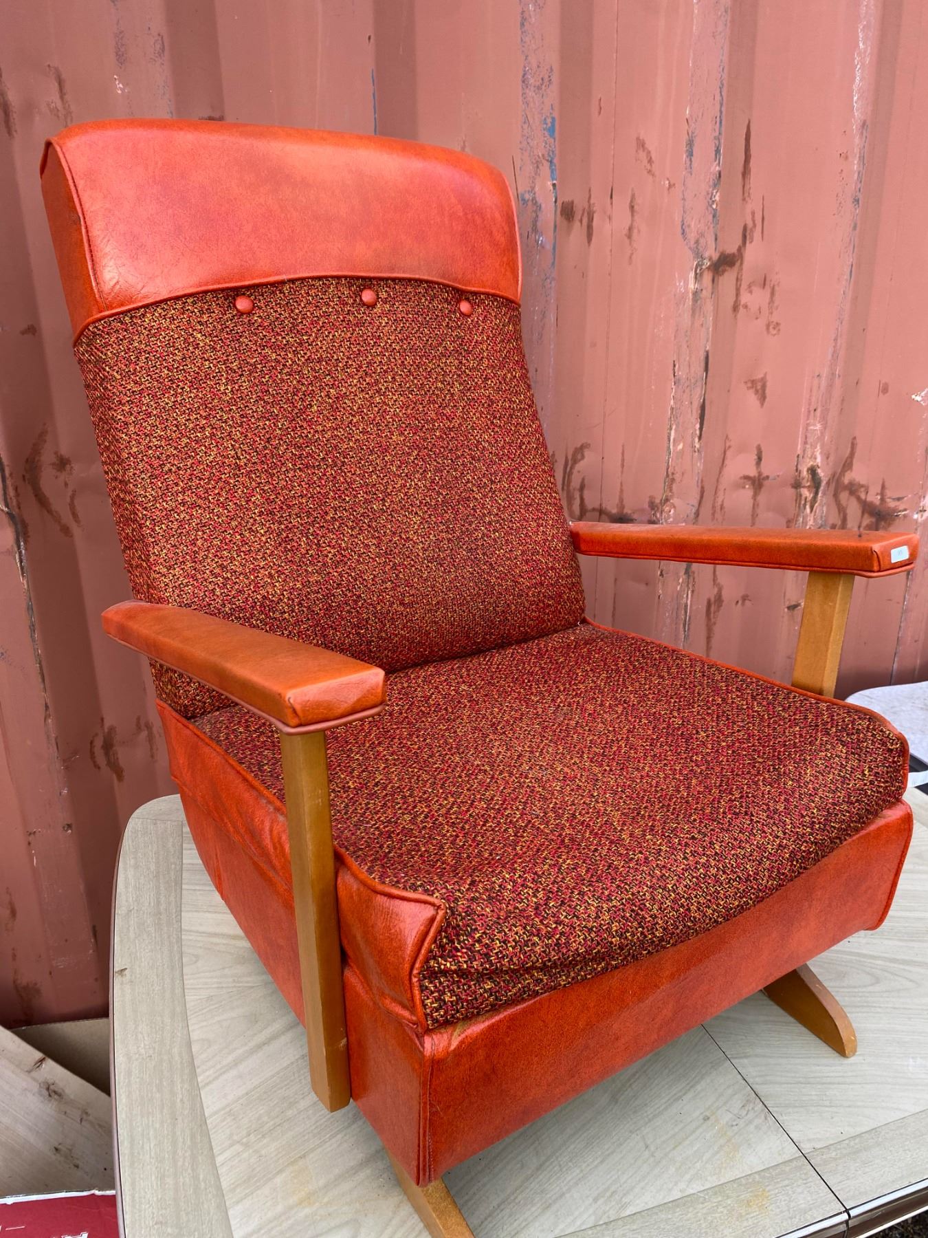 Eye-catching mid-century armchair with bold orange vinyl accents and textured woven fabric. Solid wooden arms and a classic profile make it a standout retro seating piece. Shows light age wear.
