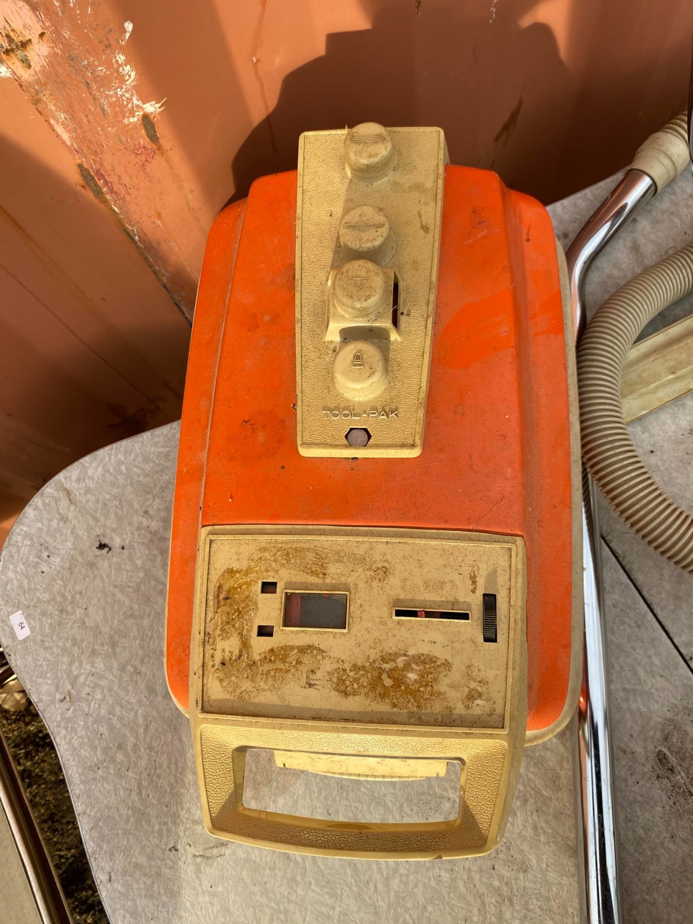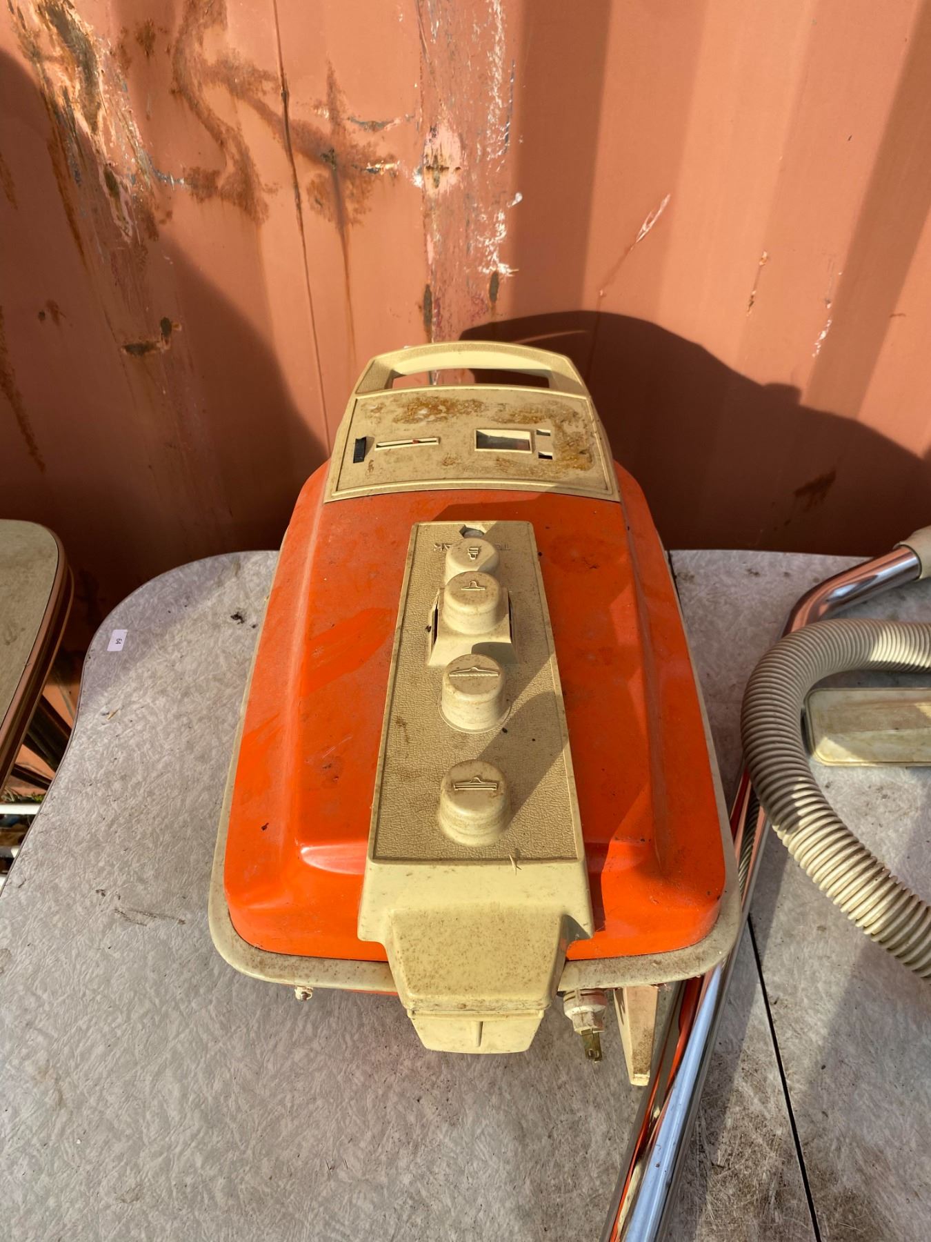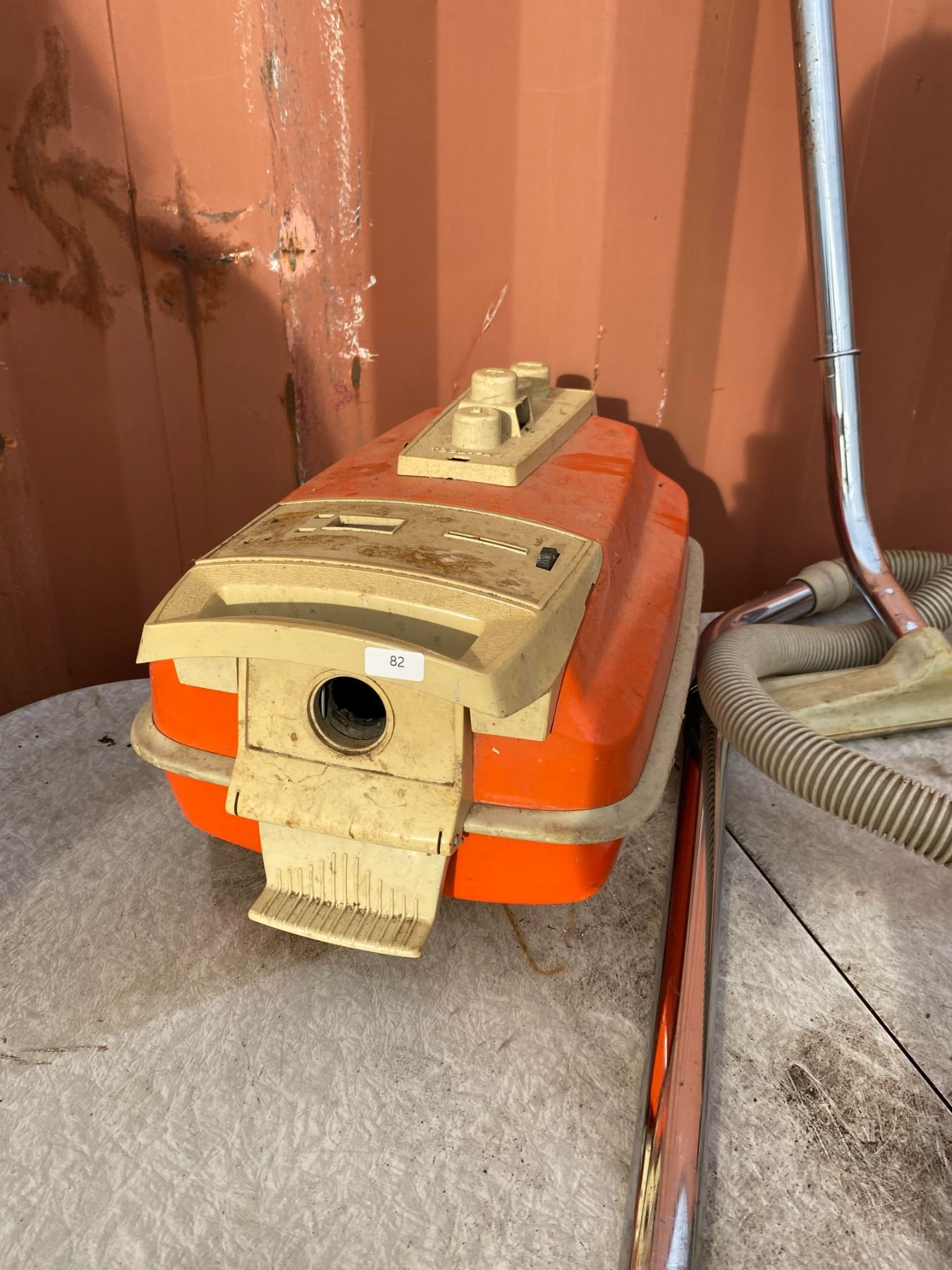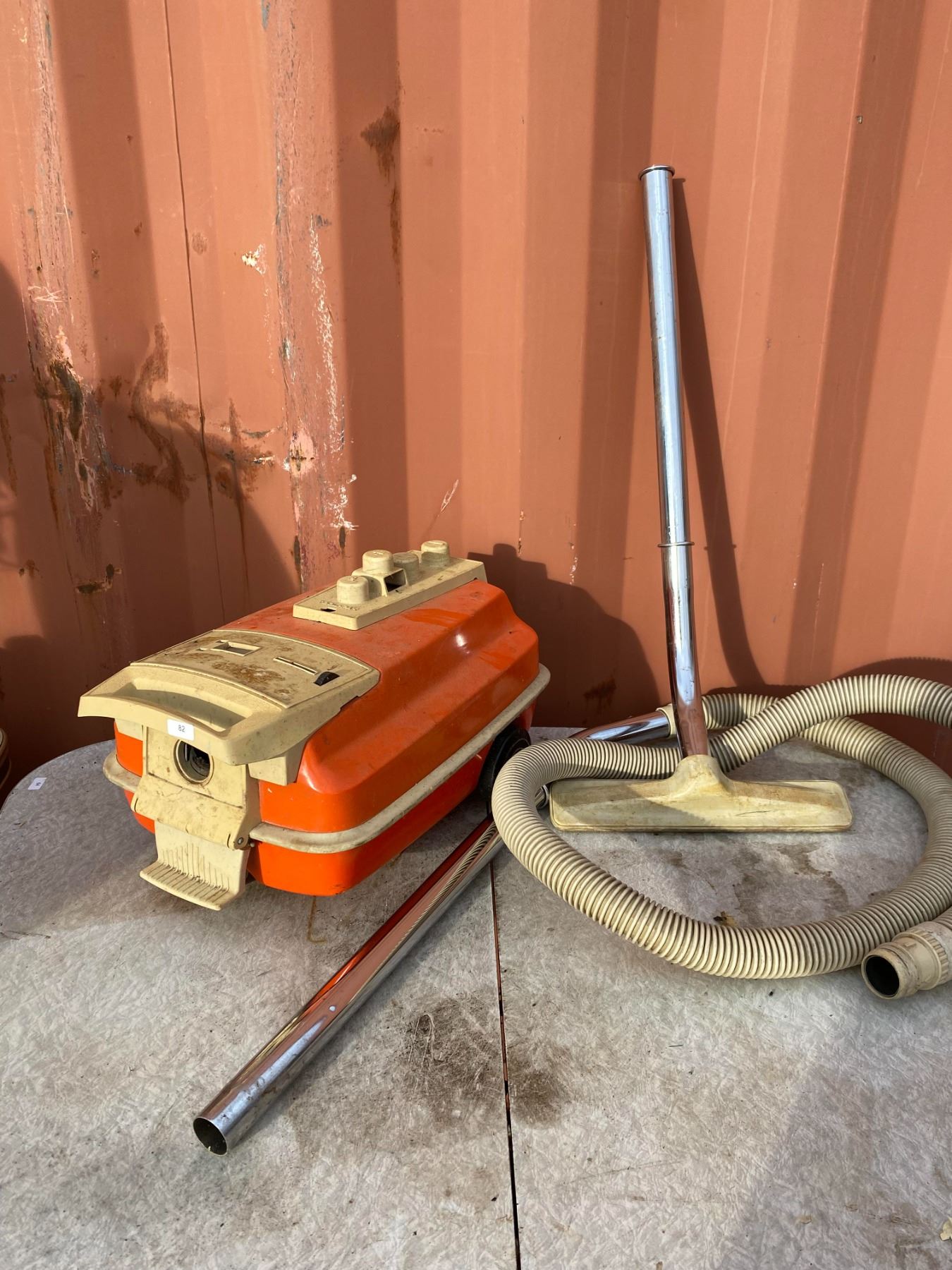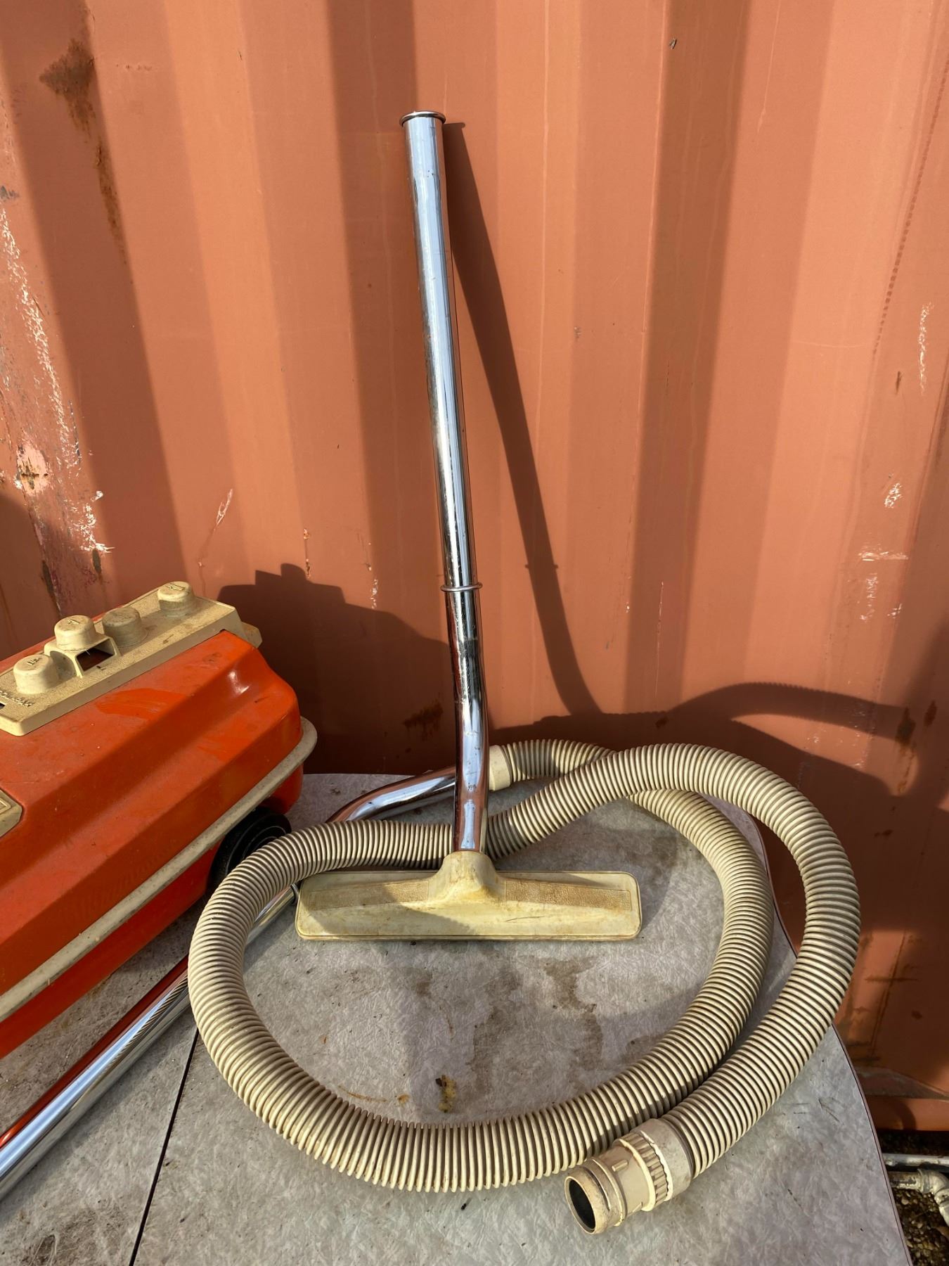 Classic orange canister-style vacuum with hose and attachments; appears untested and shows age wear from storage.