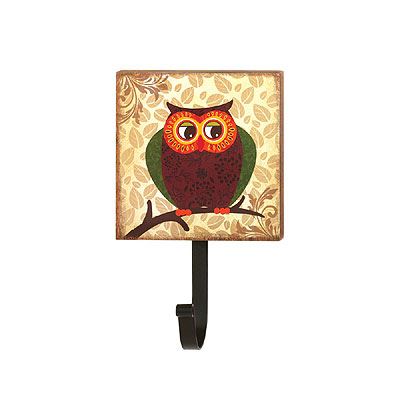 Retro Owl Wall Hook **|**|** Functional dcor can be a real hoot, especially with this darling wall-mounted hook. The metal hook can hold your bag, coat or purse and is topped with a wooden plaque decorated with a cute retro-style owl. His green wings, colorful face, and damask-design body make this a functional and fashionable room accent. Saw-tooth on back for hanging. Item Weight: 0.4 lb. 5 x 2-1/2" x 8-1/8" high. MDF wood and metal. ."