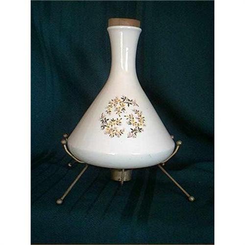 Unusual bottle made of pottery with a real retro flavor. This bottle sits on a metal stand on legs. There is a holder for a tea light. This bottle with a cork stopper measures 10 inches high. The bottle is in very good condition with no chips or cracks.