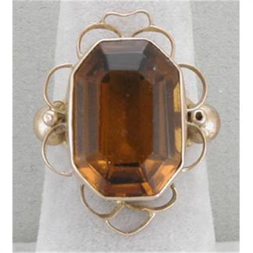 Impressive rose gold (10K, unmarked, but tested) set with an unusually shaped custion-cut citrine, measuring 12MM x 17MM (estimated wo weigh over ten carats).  It is a size 7 1/2 and weighs 7.5 grams.