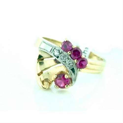 Nice combintation of stone and design make this ring a winner. Beautiful piece from The Retro 1940's. This classic features bright shiny diamonds and rich fiery rubies set in beautifully designed 14k yellow gold. A ring that is not only wearable but also collectible.