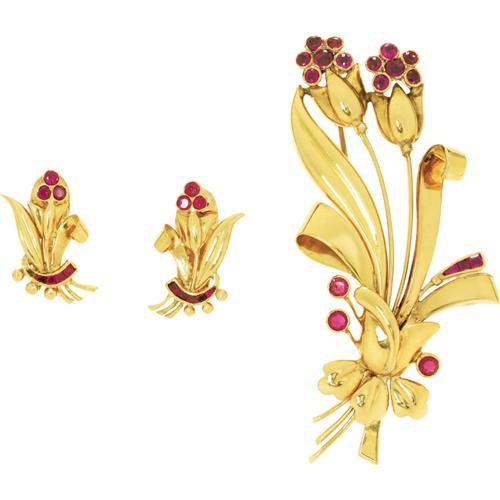 <B>Retro Ruby, Gold Jewelry Suite</B></I><BR><BR>The floral themed suite includes an oversized brooch featuring round and baguette-cut rubies, set in 14k gold; together with a matching pair of clip style earrings. Circa 1940. Gross weight for the suite 34.90 grams.<BR><I>Brooch Dimensions: 2-7/8 inches x 1-1/2 inches <BR>Earrings: 1 inch x 1/2 inch</B></I> <B>Condition Report:</B> Brooch, Earrings Suite<BR><BR>Colored Gemstones: Ruby<BR><BR>Average Clarity: Good<BR><BR>Shapes: Round, Square, Other<BR><BR>Gemstone Count: 26-50<BR><BR>Notes: Set is in very good condition. Rubies have bright purplish-red color. Circa 1950. Earrings are designed for non-pierced ears.<BR><BR><BR><b>Shipping:</b> Miscellaneous Collectibles, Smal (<a target="_blank" href="http://www.heritageauctions.com/common/shipping.php">view shipping information</a>)