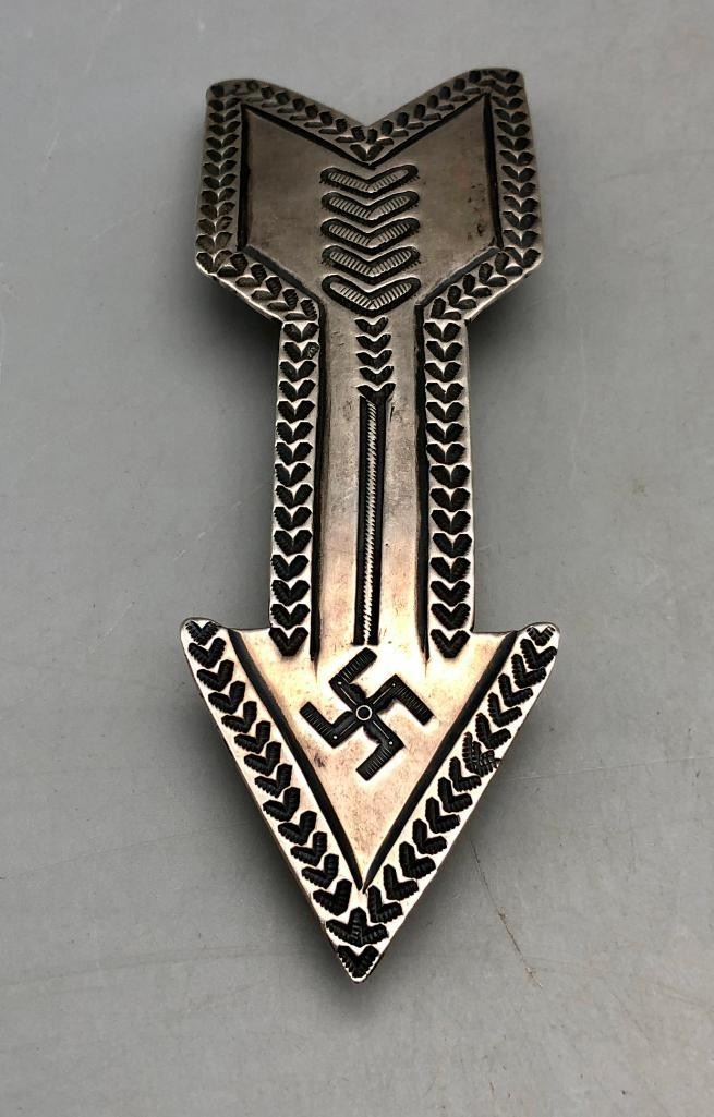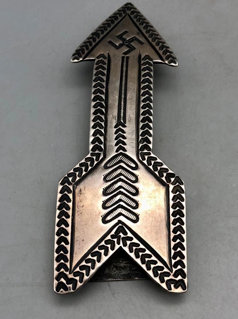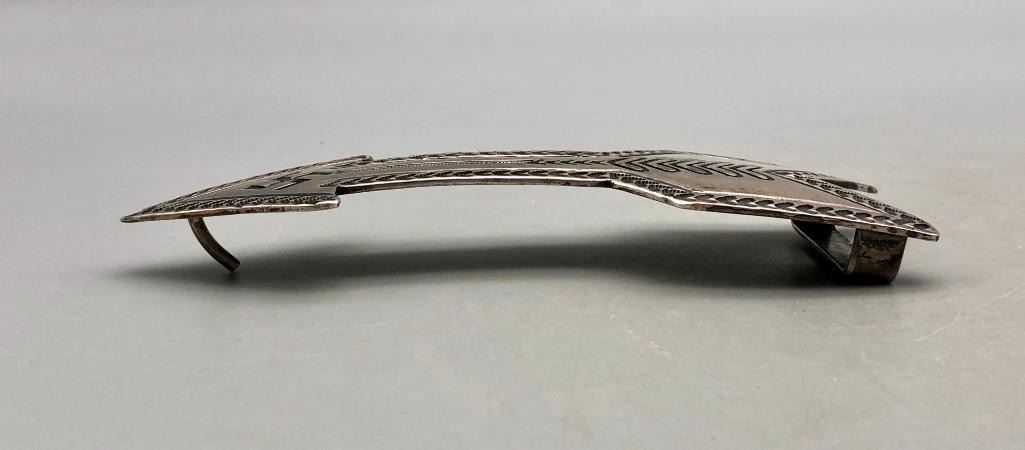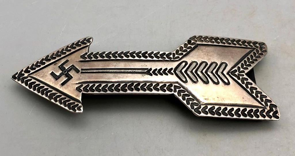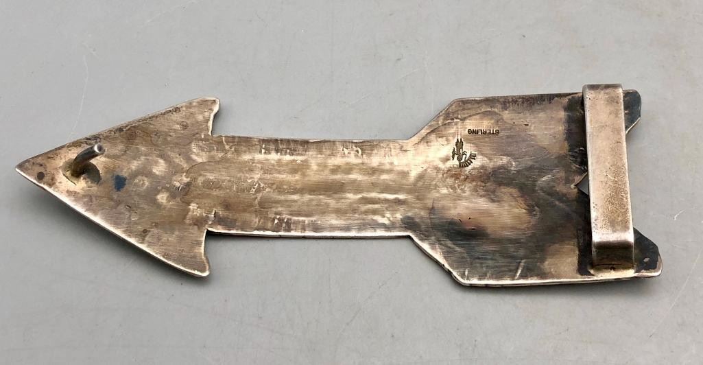 Offered for sale in this lot is a stunning retro style belt buckle shaped like an arrow. It has great hand stamped designs and is stamped as sterling silver. Maker: Hallmarked with the Monsterslayer. John B. Begay, Navajo. Active since the 1970s. Approx. Age: Fairly modern. Size: 5-1/2 inches wide X 1-7/8 inches tall. Fits 1-1/2 inch belt. Weighs 67.6 grams. Condition: Good for its age, normal wear expected. Please look closely at the pictures - they are an important part of our description. Shipping: There will be a $5 handling / packaging fee for shipping this lot. The actual cost of postage will be added on top of that. BUY IT NOW: If you would like to buy this item now without waiting for the auction to end (this option is only available up to 48 hours before the auction starts to close), the “Buy it Now” price is the high estimate of this lot. If you would like to end the auction early and pay the high estimate (plus applicable fees), please contact us by phone or email and reference this lot number.