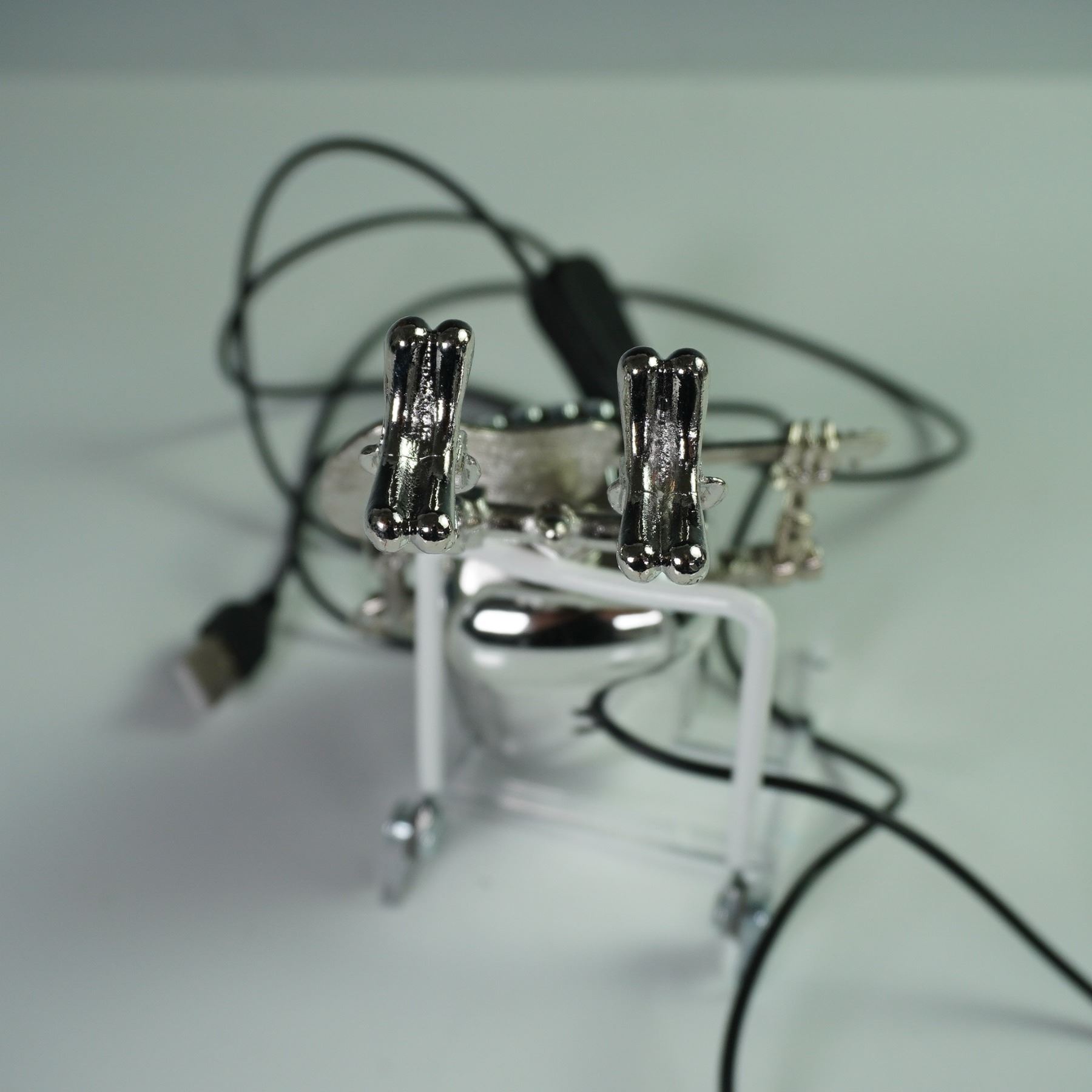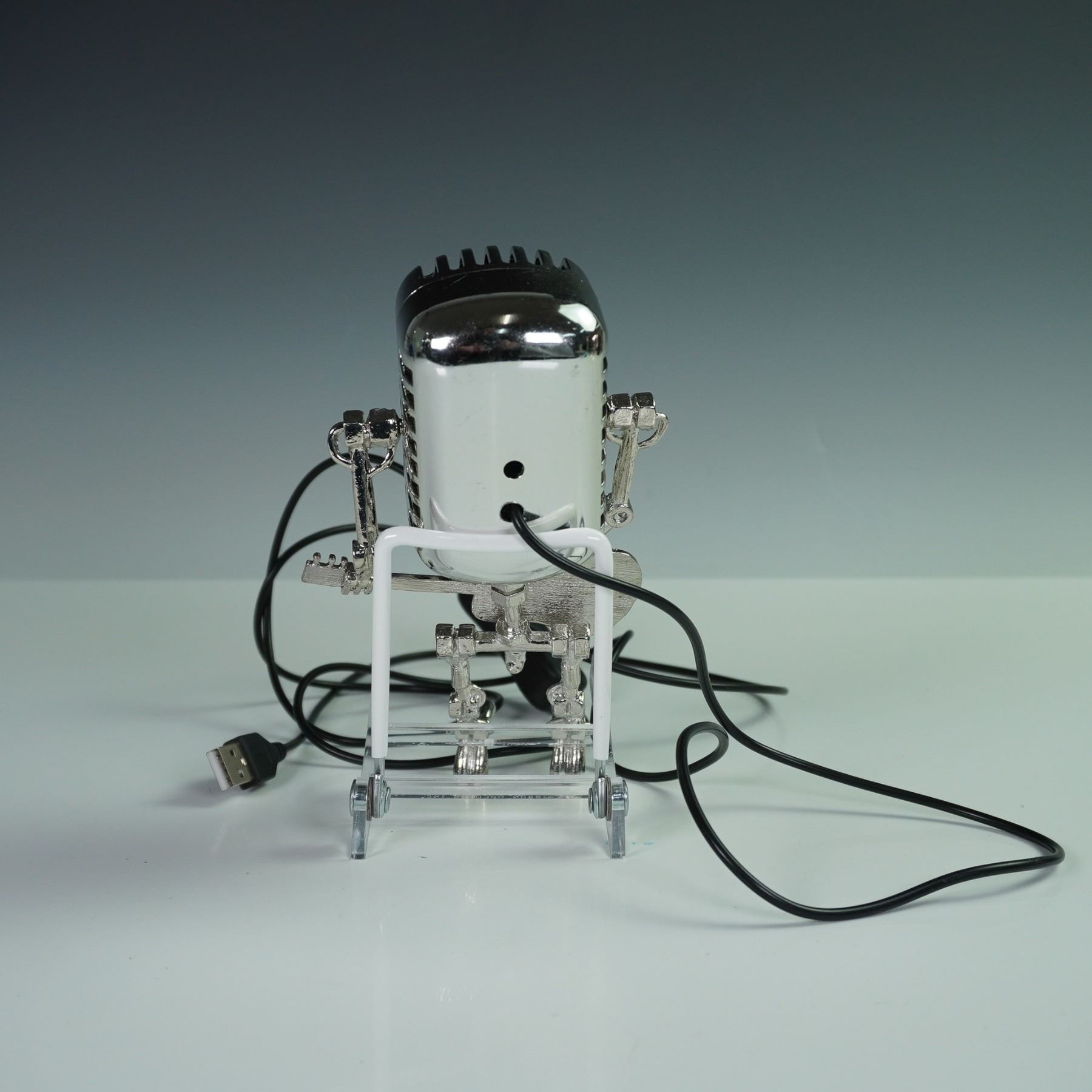 A robot-style novelty lamp designed in the shape of a vintage microphone character holding an enamel yellow guitar. The piece is constructed from chrome-tone aluminum and acrylic. Includes articulated limbs and a detailed grille resembling a classic broadcast microphone. It is equipped with a USB cable for power and functions as a small accent lamp. The lamp is intended for use as a desk, shelf, or nightstand accessory. The power cord is permanently attached at the back.