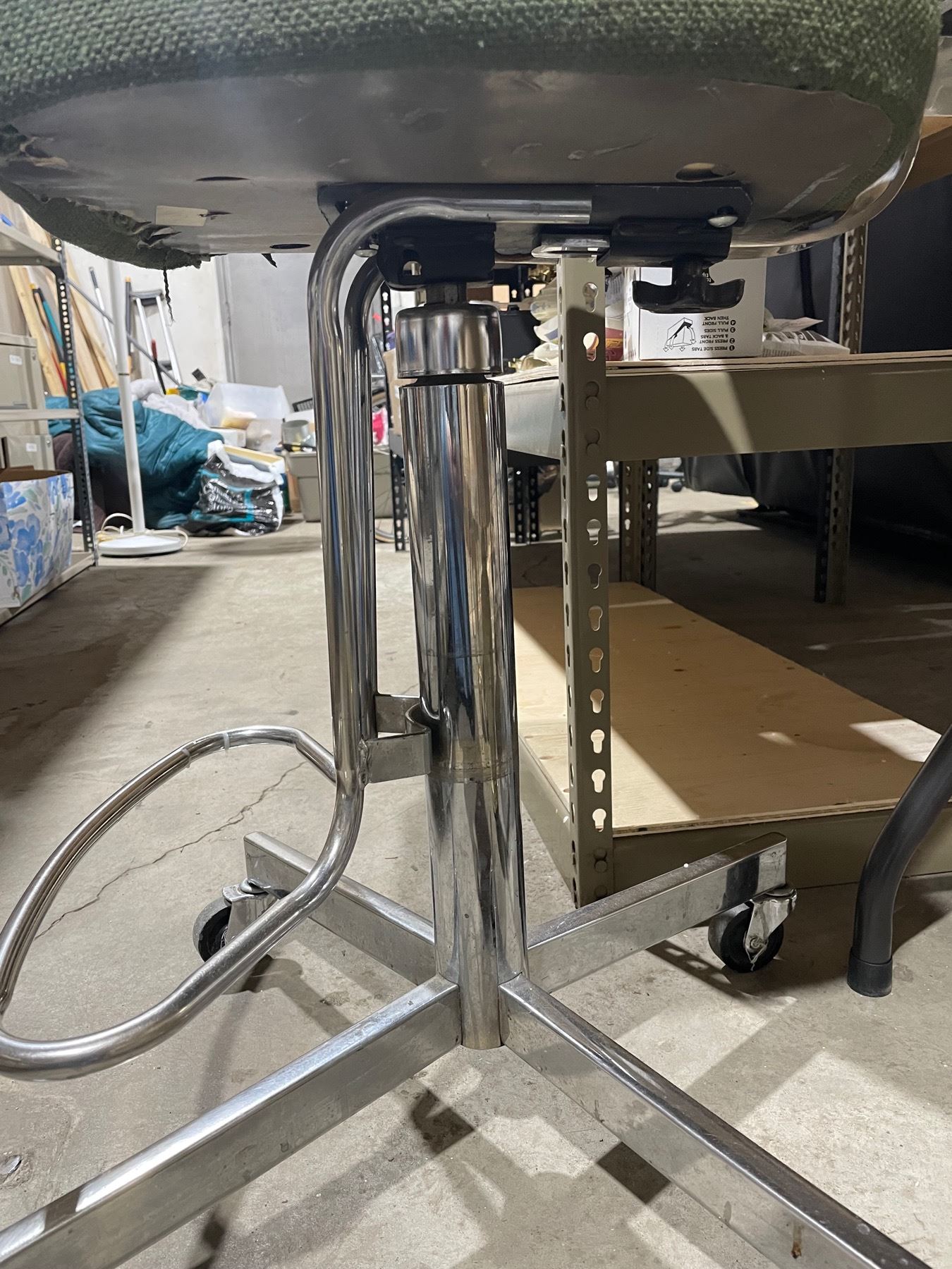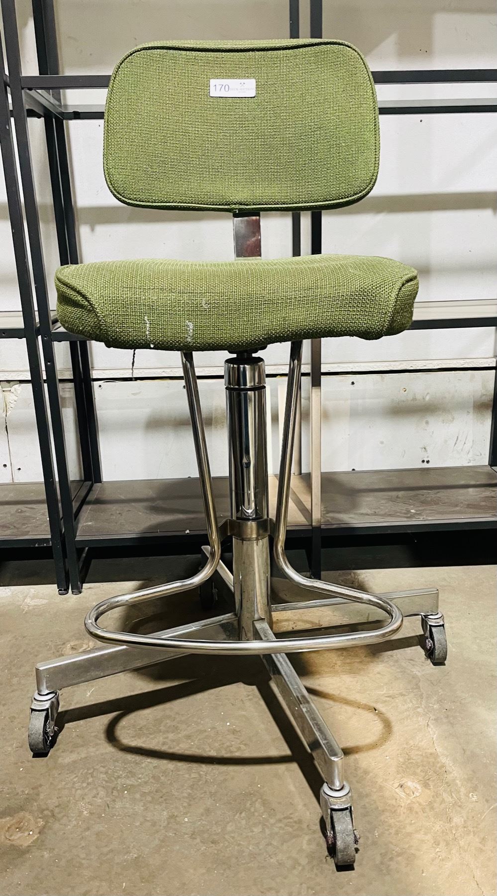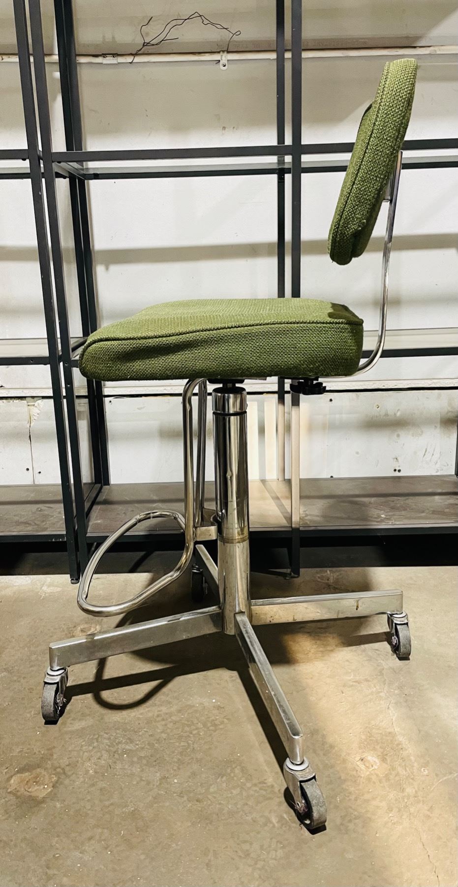 Retro upholstered Rolling Chair / stool with steel frame. Is in used condition, is a fun piece with some potential. Measures 38 inches tall (including back rest)