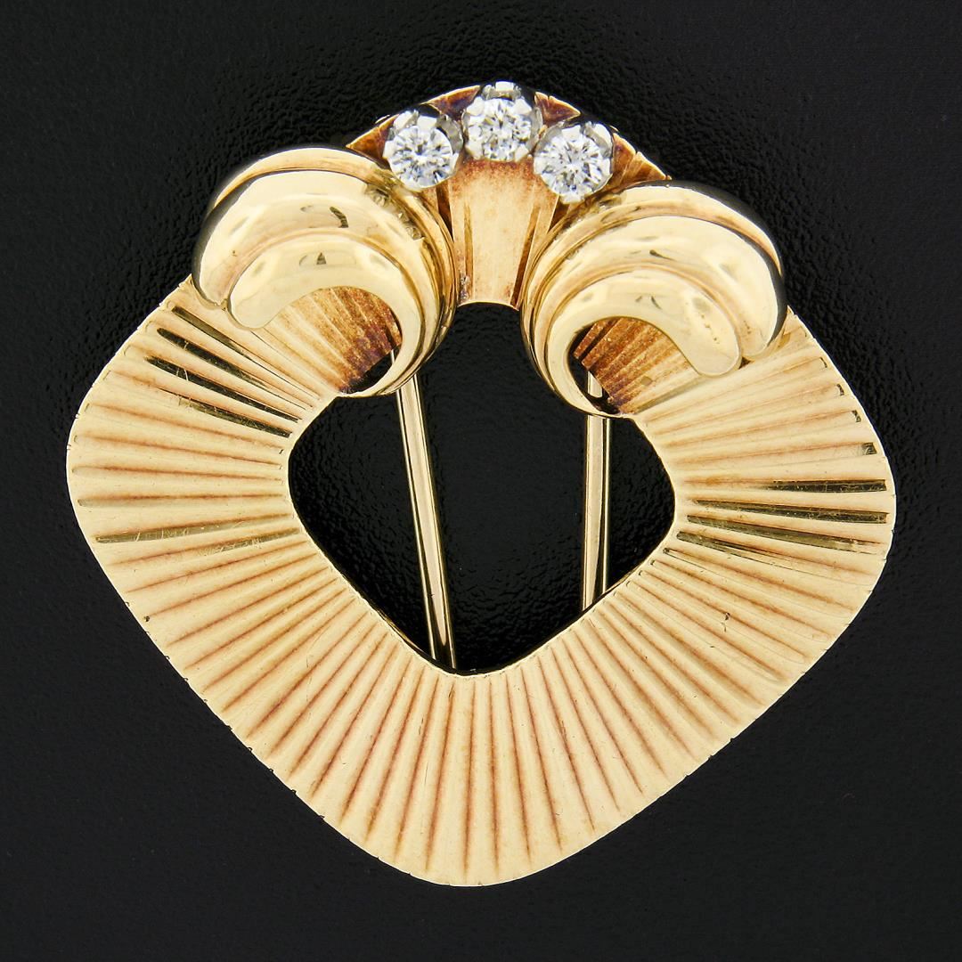 A vintage solid 14k yellow gold pin brooch, with 3 round cut natural diamonds (F-G - VS2-SI1 ; 0.12ctw). Measures 32.6x32.3mm and weighs a total of 11.14 grams.
