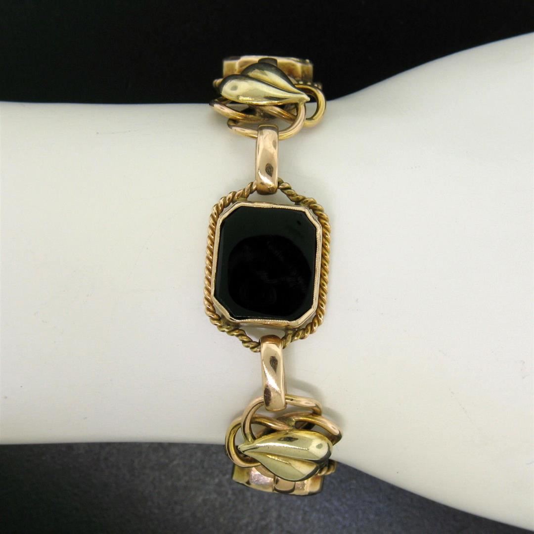 A great condition vintage 14k gold bracelet with green gold leaves on interlocked rose gold rings and three rectangular black onyx measuring approximately 13.7x11.7mm. It weighs a total of 21.59 grams, measures 15.1mm wide, and will fit up to a 7 inch wri